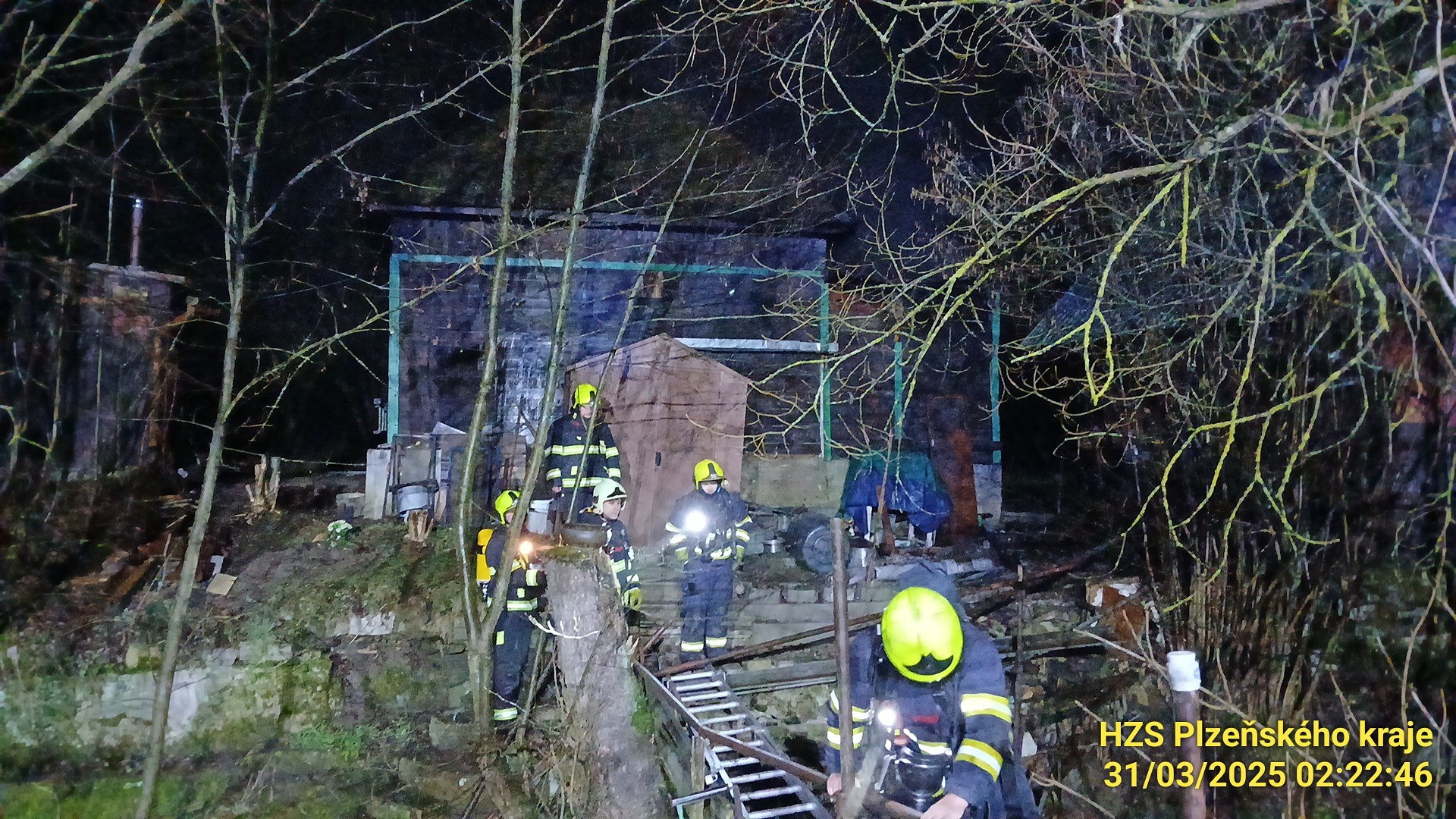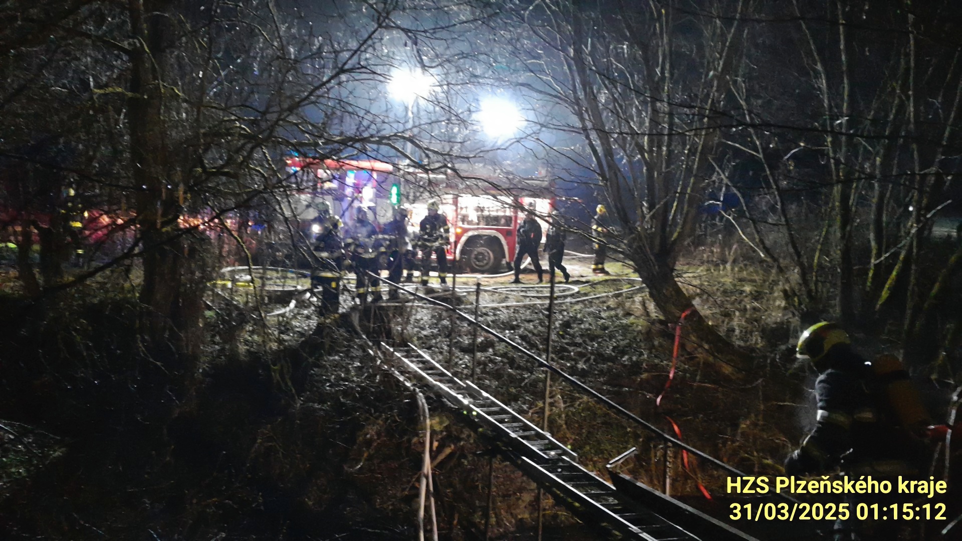 Buben, 31. března 2025 – Byla noc jako stvořená pro klidný spánek, ale pro hasiče z Nýřan, Košutky a Města Touškova se změnila v boj s časem a ohnivým živlem. Přesně 27 minut po půlnoci vyjeli k hlášenému požáru chaty nedaleko zříceniny hradu Buben. Místo zásahu? Odlehlý ostrůvek mezi řekou a mlýnským náhonem, kam se dostat s těžkou technikou bylo téměř nemožné.
