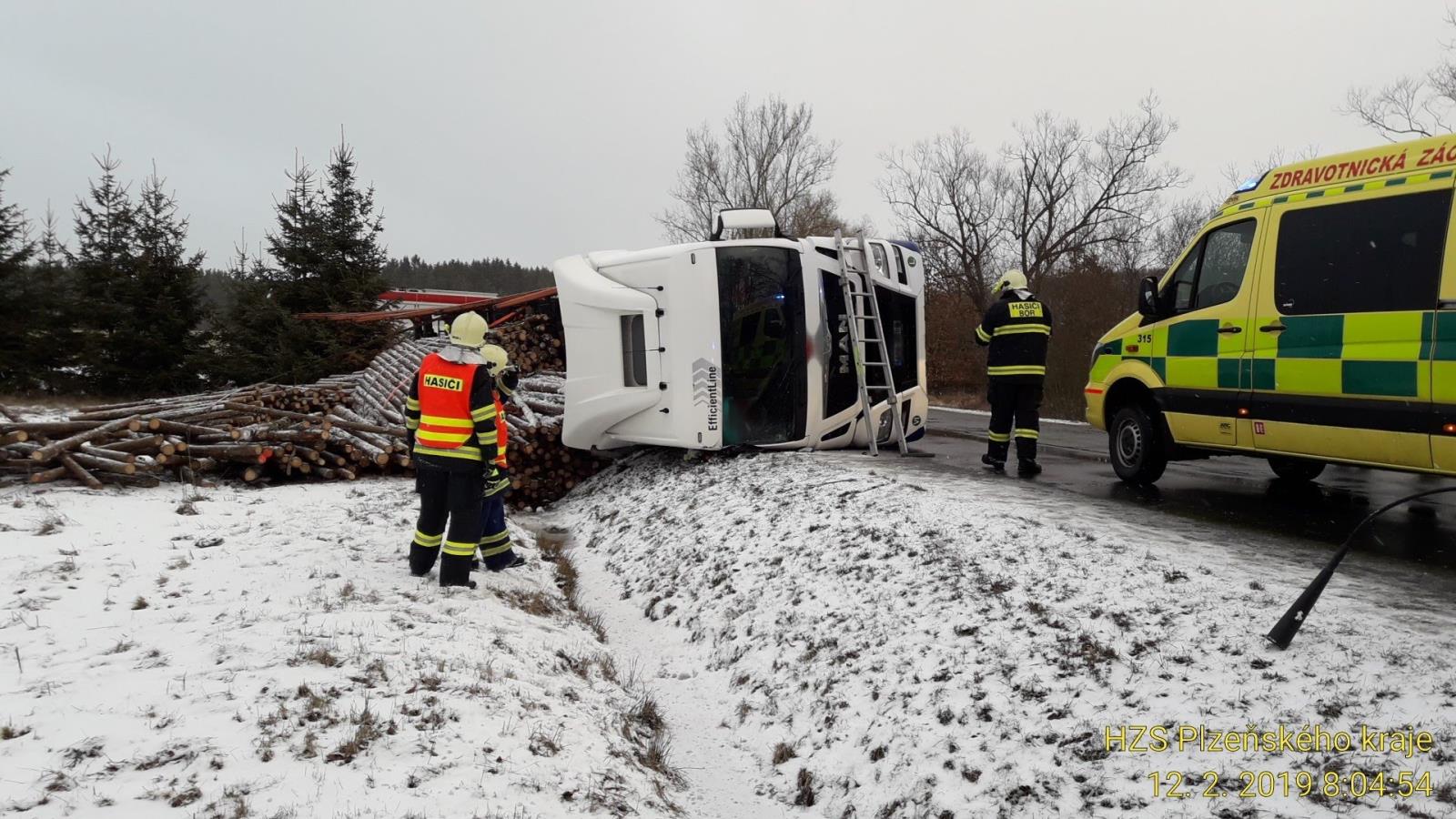 Po čase se na místo dostavilo náhradní vozidlo k přeložení nákladu dřeva. V rámci nehody došlo k poničení dvou patníků a krajnice komunikace. Místo si převzala PČR. Zásah byl ukončen po půl jedné.