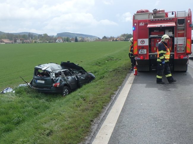 Hasiči museli z havarovaného vozidla vyprostit zraněnou řidičku. Pečovali o ni až do příjezdu ZZS, následně ji pomohli přenést do sanitky.