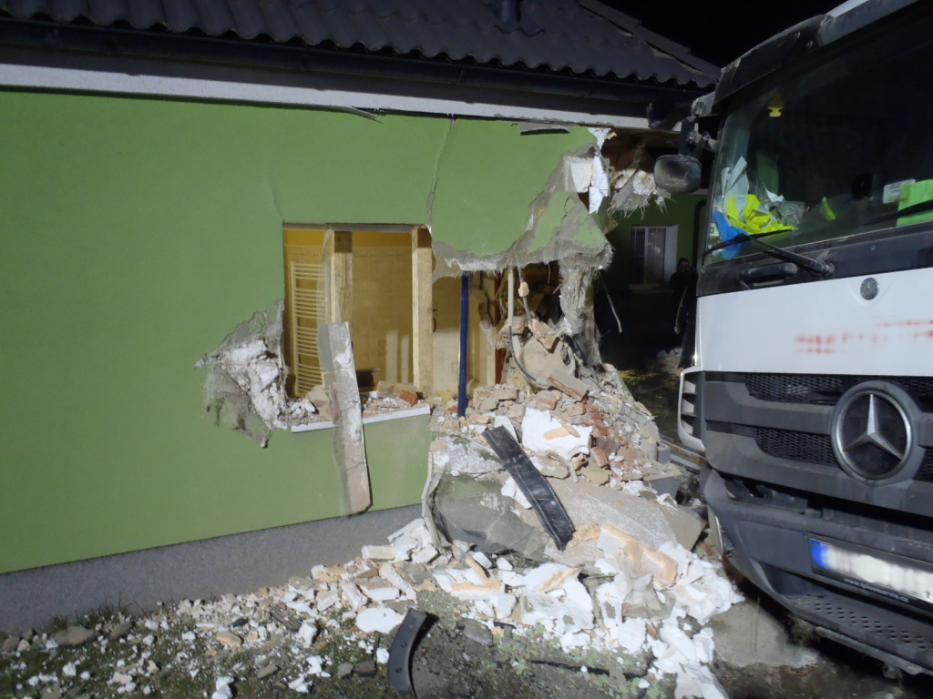 Vozidlo sjelo z komunikace a převrátilo se na rodinný dům, který poškodilo. Zraněný řidič byl předán do péče ZZS. Hasiči zapažili výdřevou poškozený dům a povolali sací bagr k přečerpání obsahu domíchávače.
