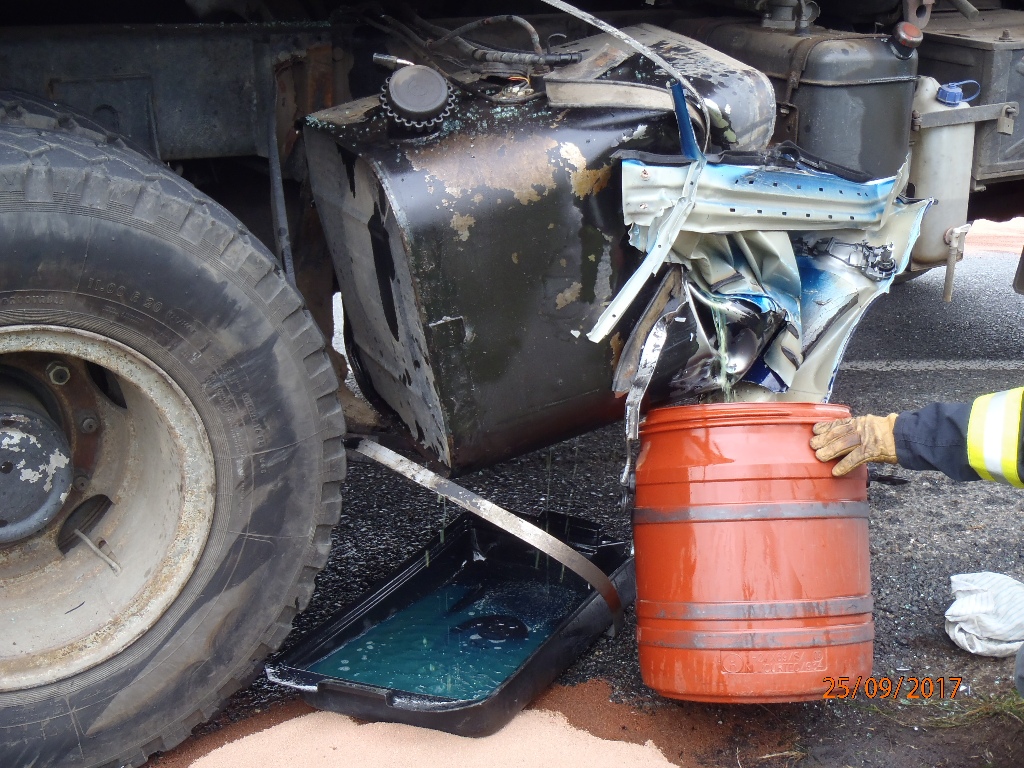 Nákladnímu autu se utrhla nádrž a došlo k jejímu proražení. Hasiči pod nádrž ustavili barel, do kterého naftu přečerpali. Uniklé PHM znečistily pouze silnici, mimo ní se nedostaly. Na likvidaci skvrny hasiči spotřebovali téměř 90 kg sorbentu.