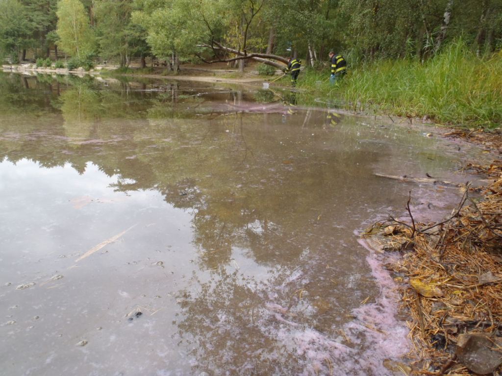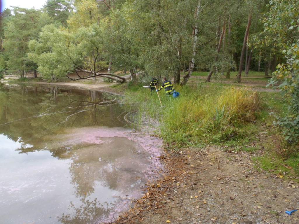 Na ploše asi 20 x 2 metry hladinu rybníka u břehu pokrývala růžová látka. Nijak nezapáchala, chovala se podobně jako tekuté mýdlo. Nebyly nijak patrné známky poškození životního prostředí.