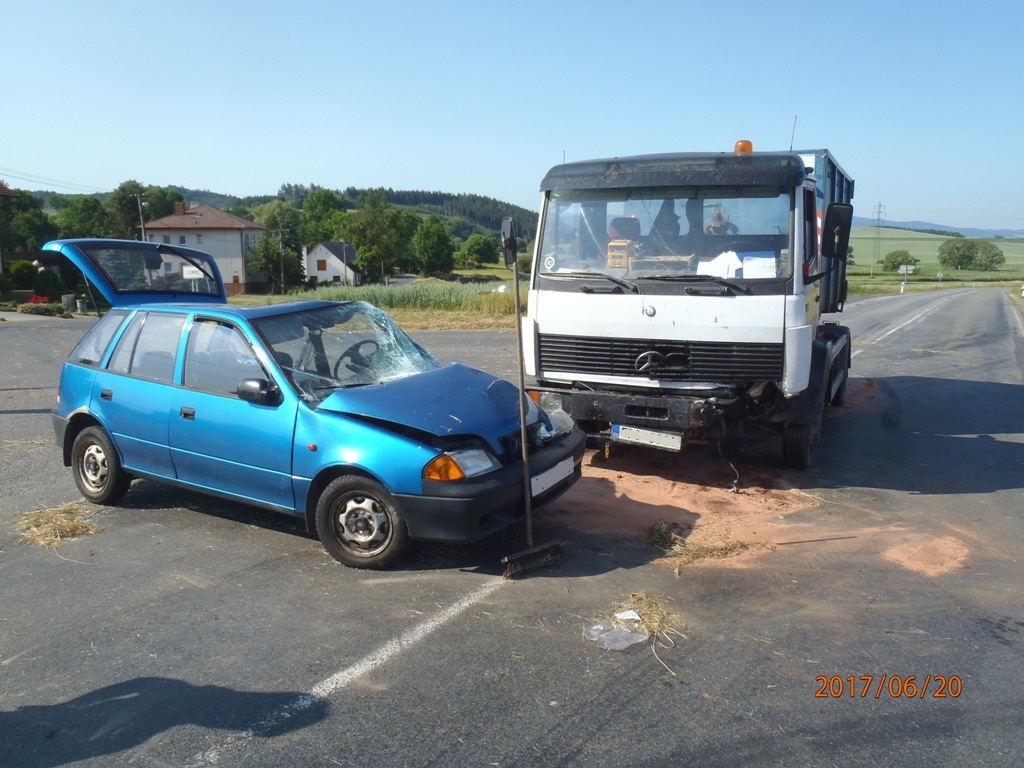Osobní auto vjelo pod nákladní auto.Nehoda na křižovatce u Lomce v Plzeňském kraji