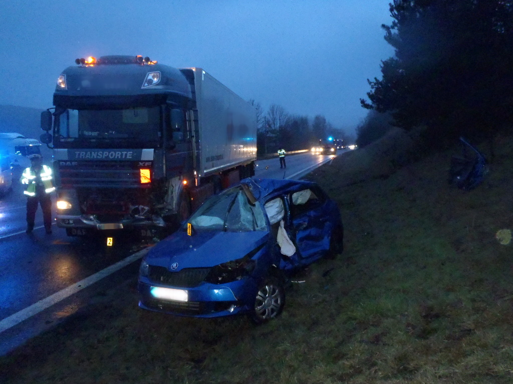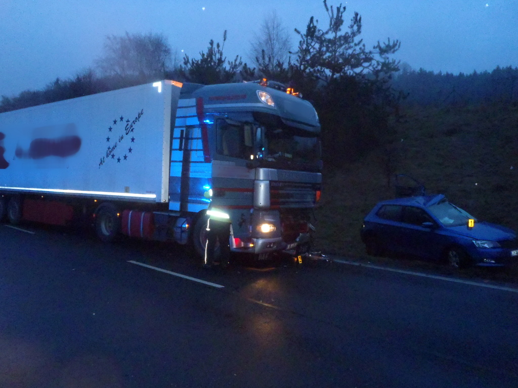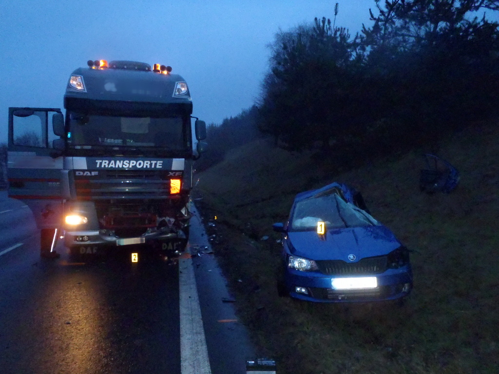 Osobní vozidlo se zde bočně střetlo s kamionem. Hasiči vyprostili zaklíněného řidiče osobního vozidla pomocí hydraulického vyprošťovacího zařízení.