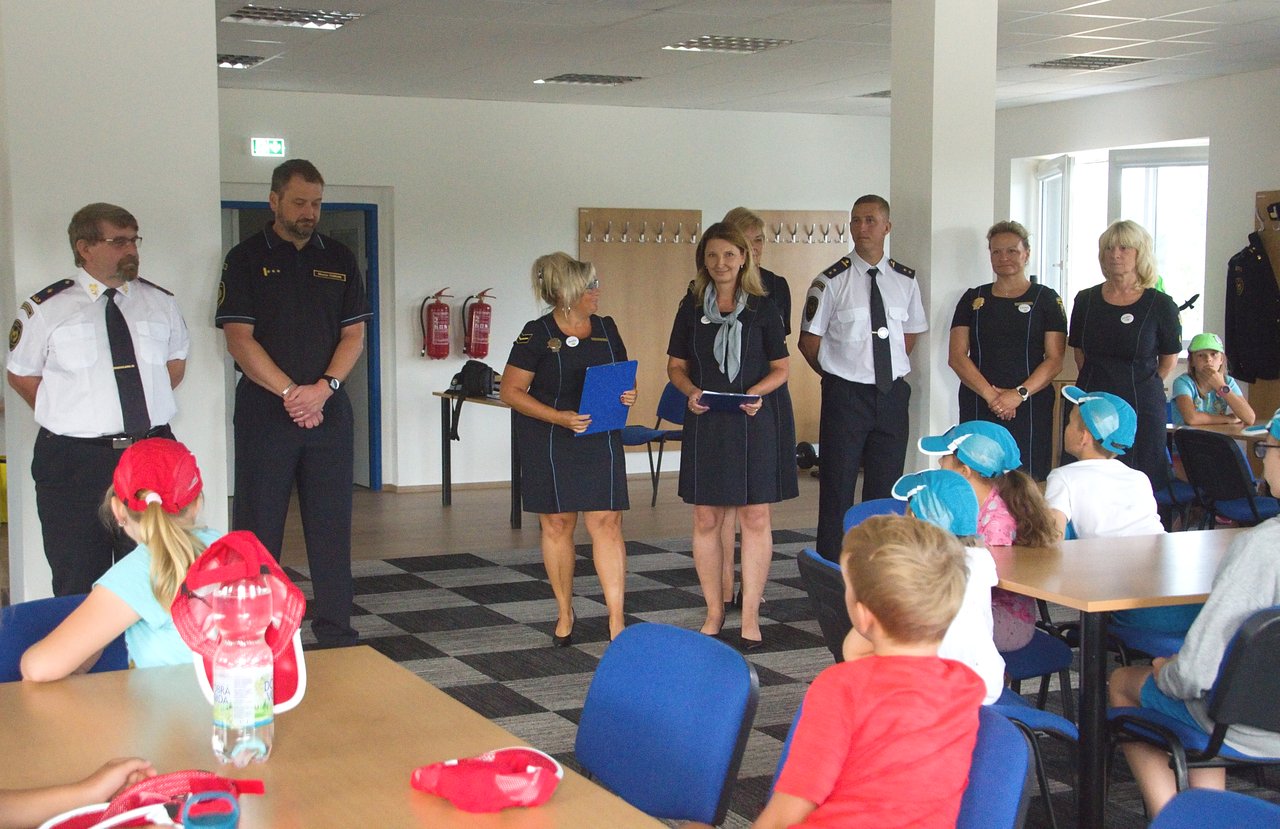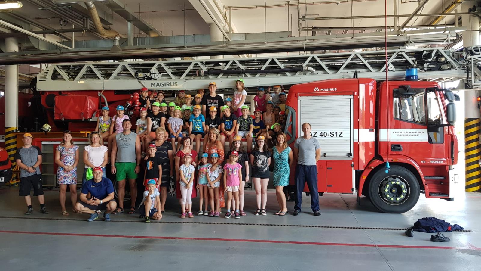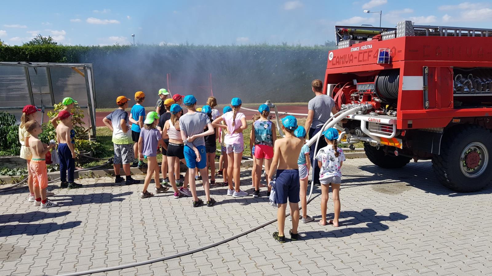 Druhý den tábora děti navštívily požární stanici Plzeň – Košutka, kde si prohlédly vozidla, prošly výcvikovým polygonem a vyzkoušely horolezeckou stěnu. Rovněž měly možnost vidět reálně, jak rychle jsou hasiči připraveni k výjezdu a odjíždějí k dopravní nehodě. Byl totiž vyhlášen poplach. Poté si děti vyzkoušely držet vší silou proudnici a stříkat na cíl. Vzhledem k horkému počasí nakonec postříkaly i sebe.
