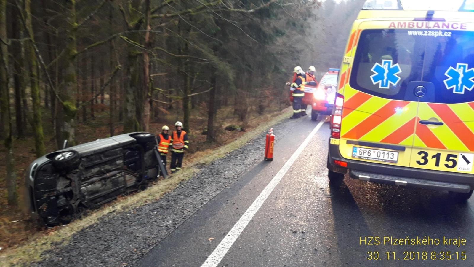 V Horní Bříze nedaleko hřbitova skončilo na střeše osobní vozidlo. Dvě lehce zraněné osoby byly předány ZZS. Hasiči zajistili místo události.