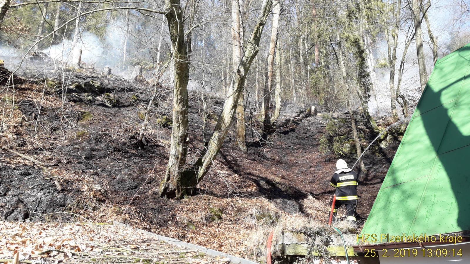 V pondělí 25.2. 2019 cca v půl jedné odpoledne vyjeli hasiči k požáru stráně v chatové osadě mezi železniční zastávkou Šťáhlavice a hradem Lopata.