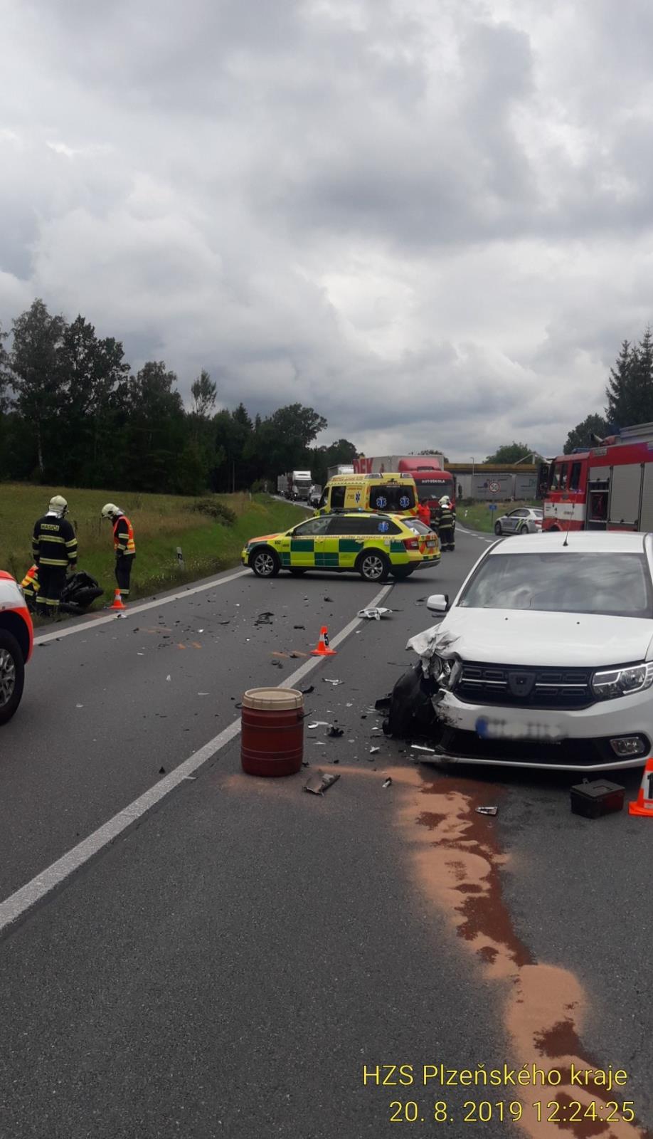 Další nehoda, tentokrát osobního vozidla a motocyklu se stala po dvanácté hodině na silnici č. 26 u odbočky na Trhanov. Hasiči zajistili místo události. Zraněný řidič motocyklu byl předán ZZS.