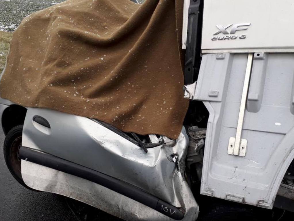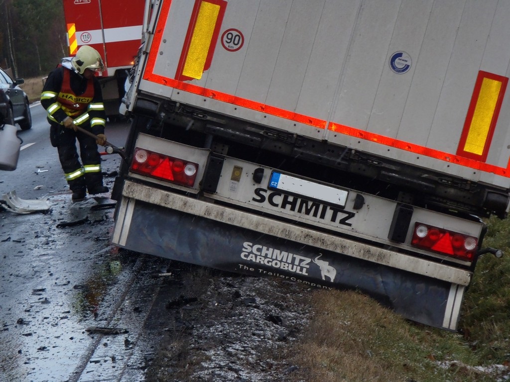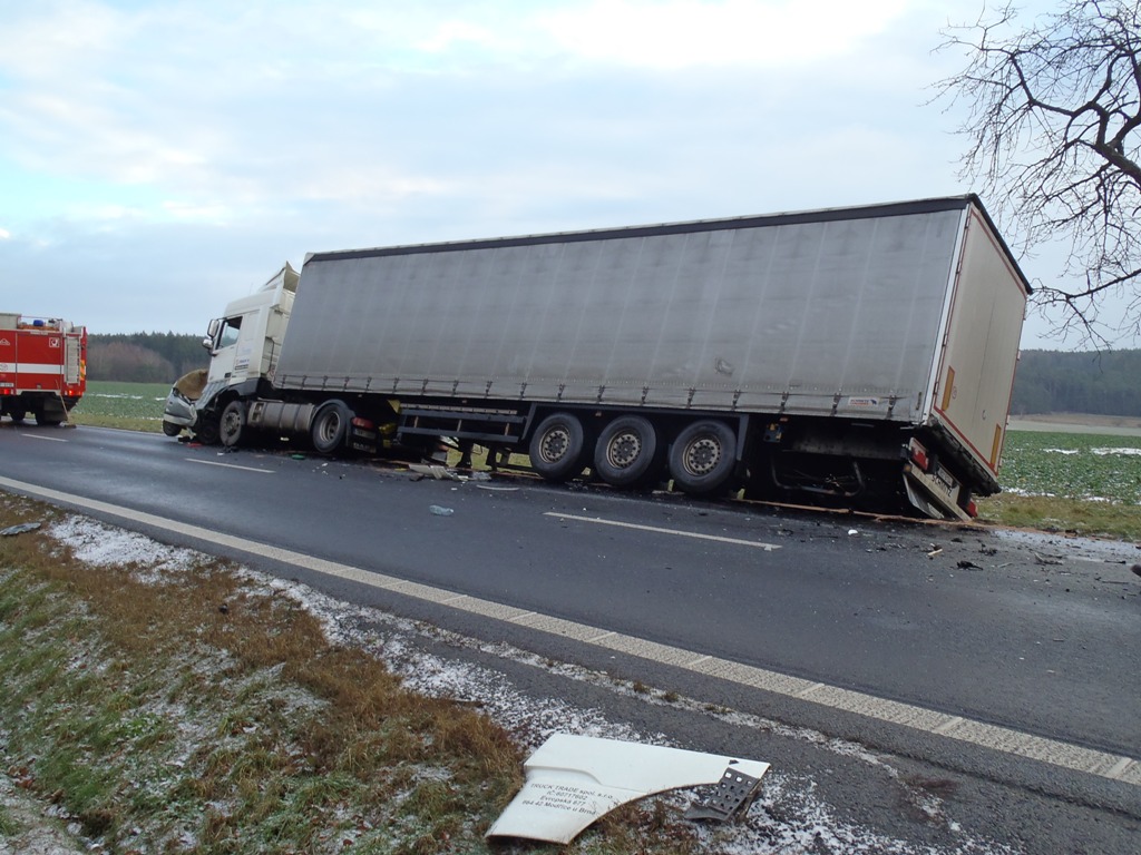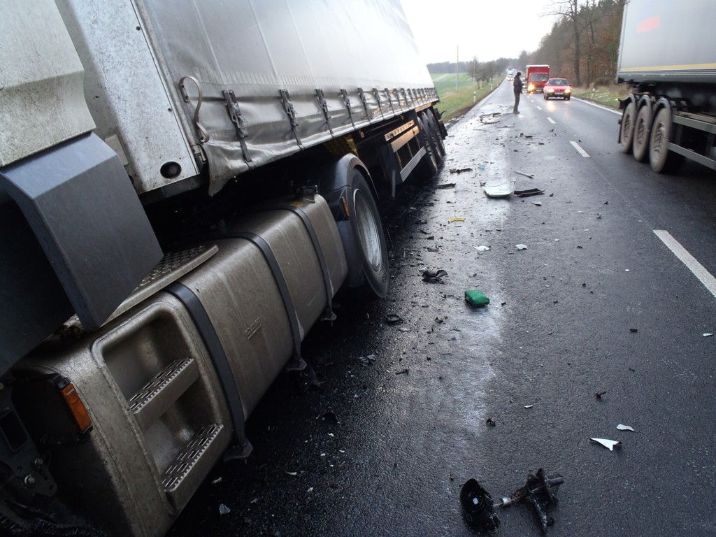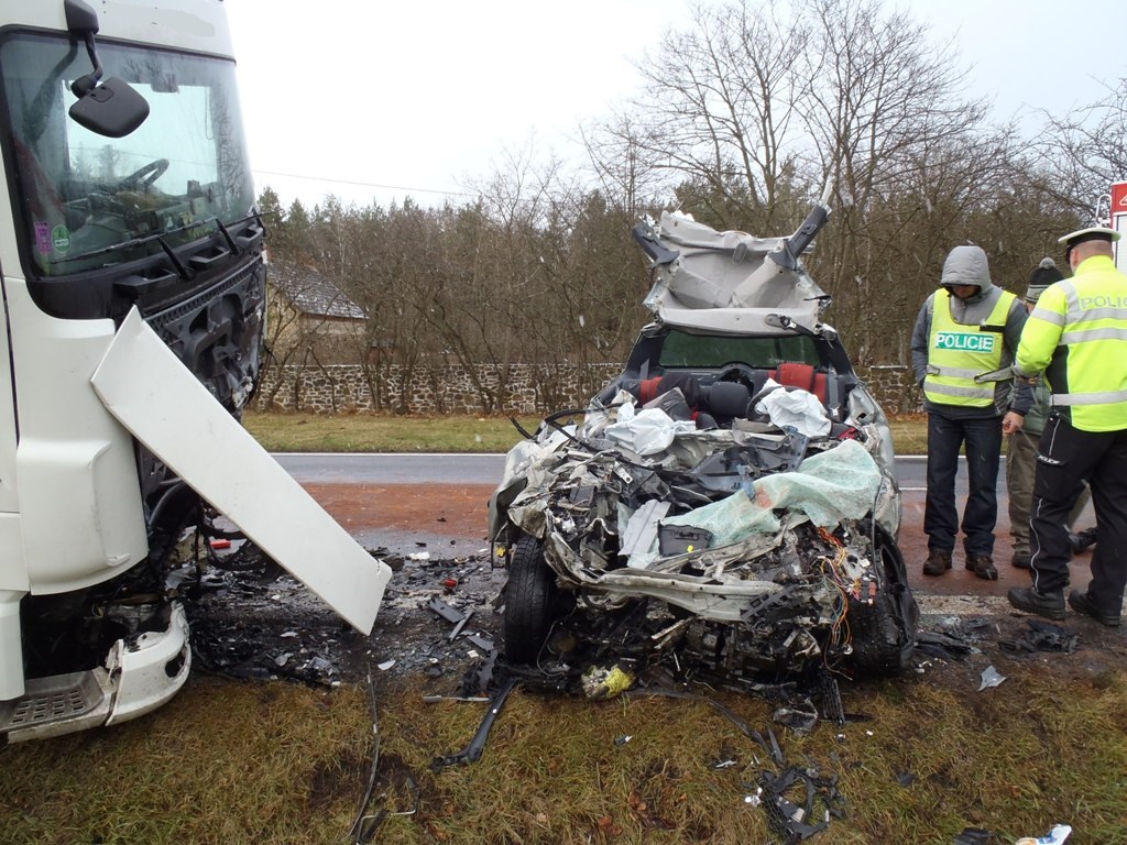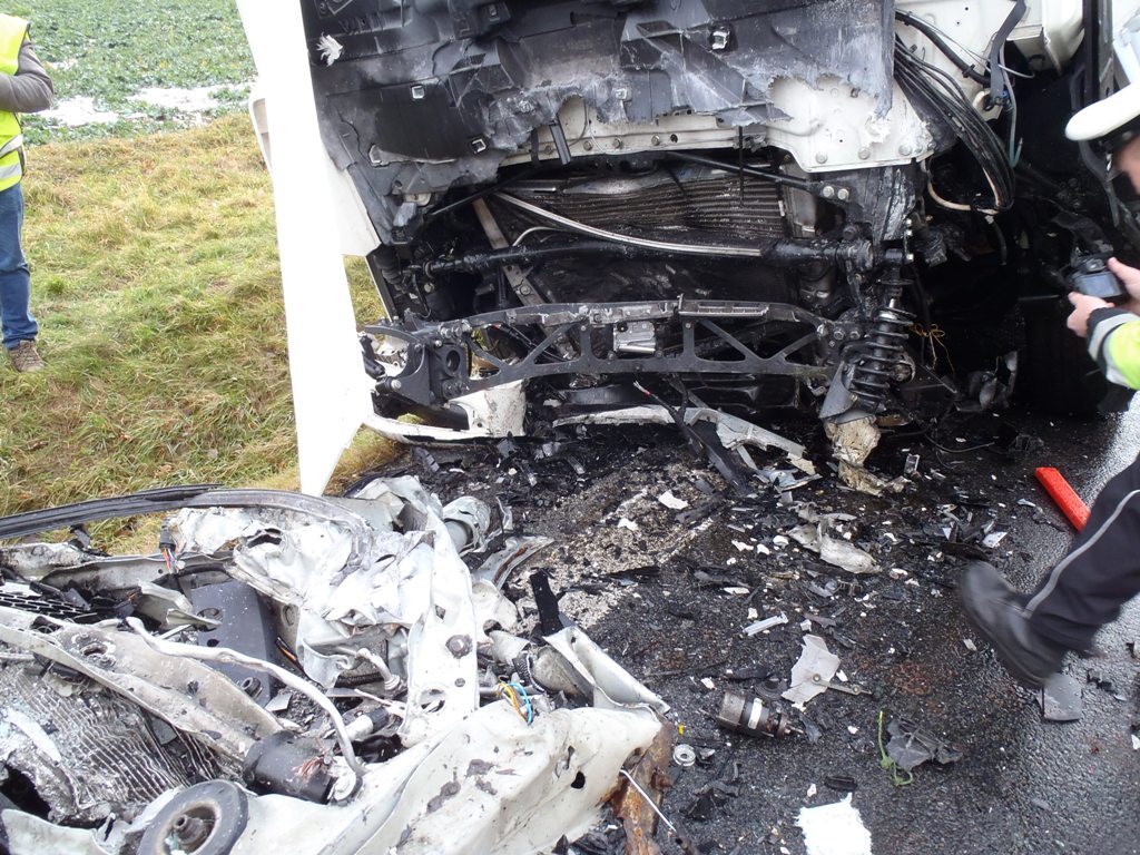 Osobní auto se čelně zaklínilo pod kabinu tahače, jeho řidič ve zdemolované kabině podlehl smrtelnému zranění. Kamion pravou částí sjel ze silnice a návěs se nebezpečně naklonil nad příkop. Řidič kamionu vyvázl s lehkým poraněním.
