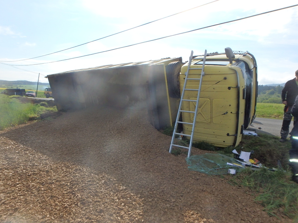U Skomelna se převrátil kamion, řidiče museli hasiči vyprostit