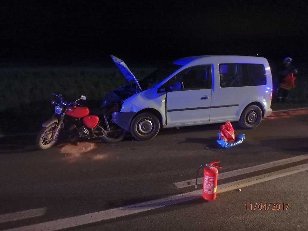 V úterý 11. dubna 2017 půl hodiny po 22. hodině vyjely jednotky HZS Přeštice a SDH Dobřany za obec Vodní Újezd k dopravní nehodě osobního auta s motocyklem.