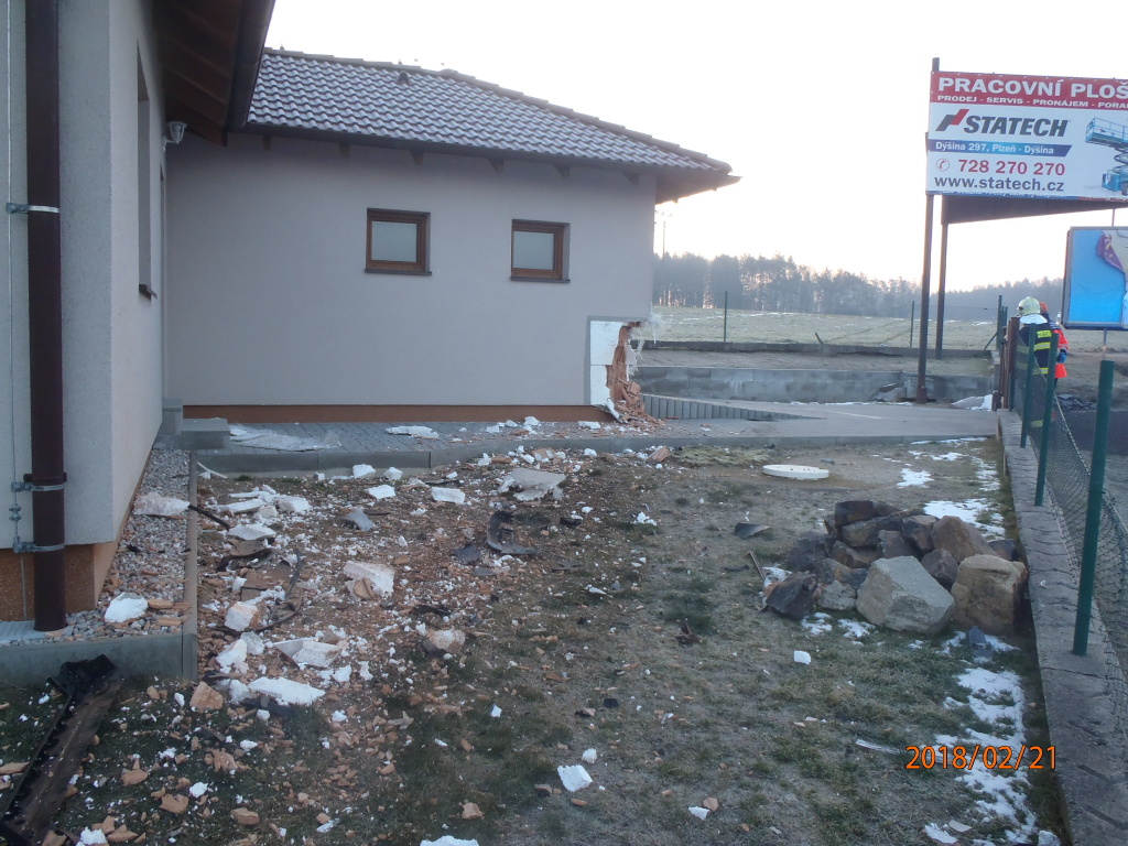 Při nárazu vozidla do budovy došlo k poškození rohu garáže. Poškození zdiva nevykazovalo stav, který by vyžadoval odborné posouzení statika. V budově se nikdo nenacházel a majitel nebyl v době zásahu na místě.