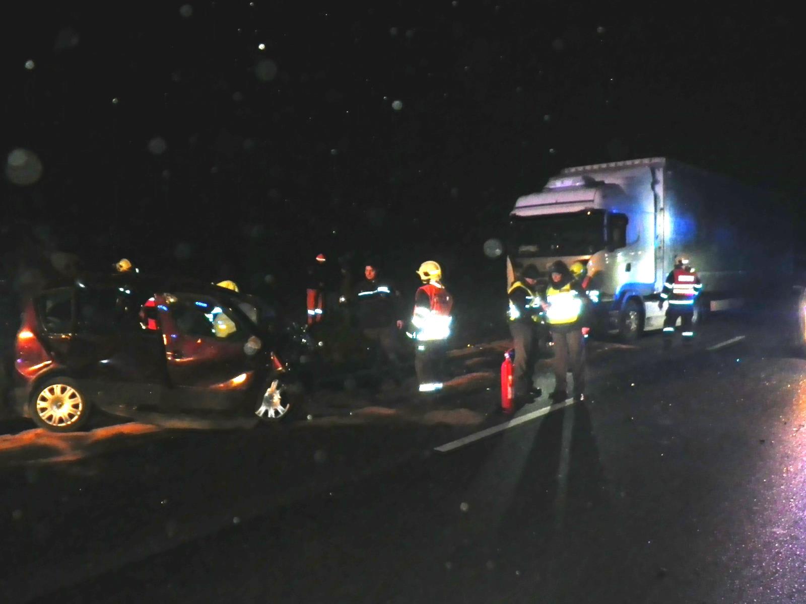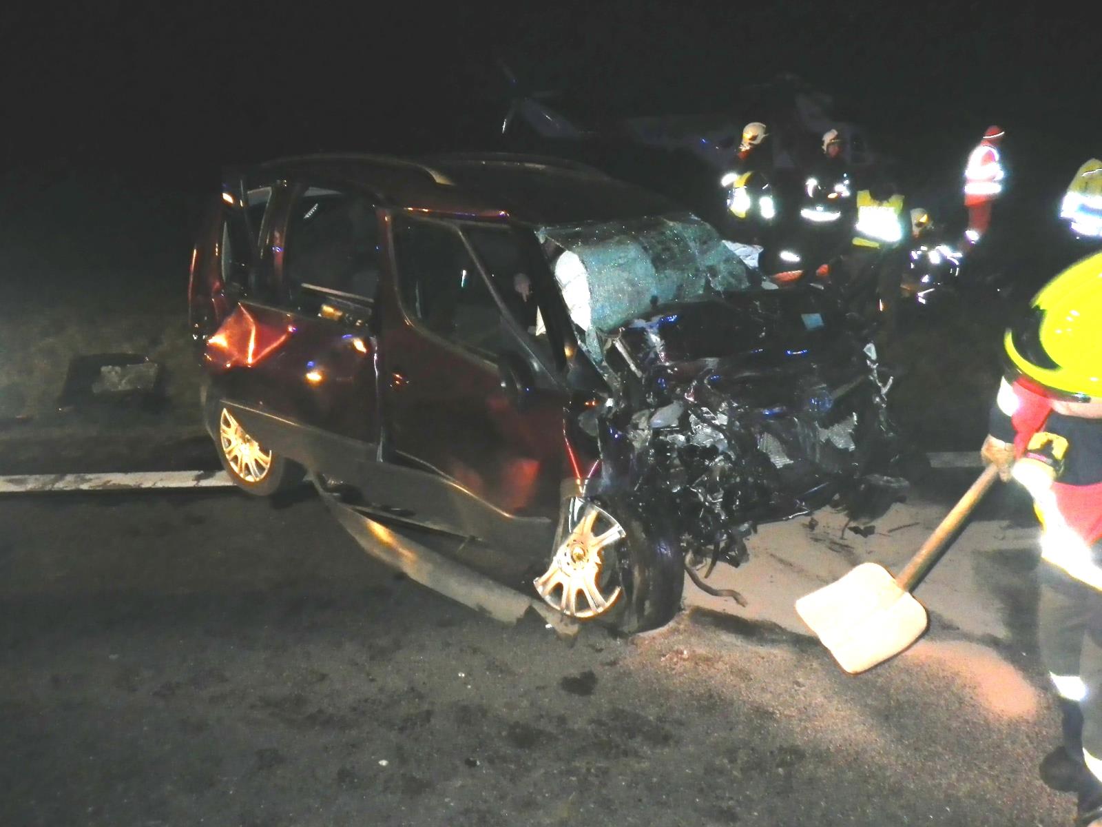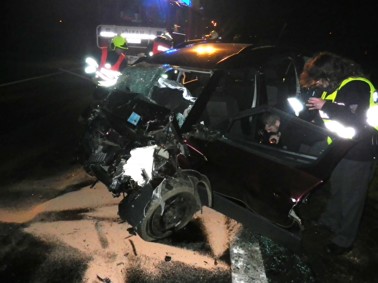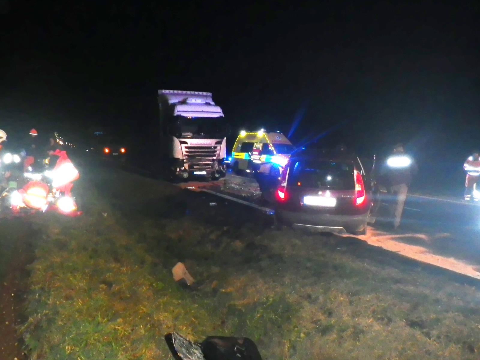 Osobní auto čelně narazilo do kamionu. Ve zdemolované kabině zůstal zaklíněný řidič. Hasiči ho společně se záchranáři LZS vyprostili a okamžitě zahájili resuscitaci. Jeho zranění byla natolik vážná, pokus o jeho oživení nebyl úspěšný. Řidiče kamionu odvezla ZZS do nemocnice na vyšetření.