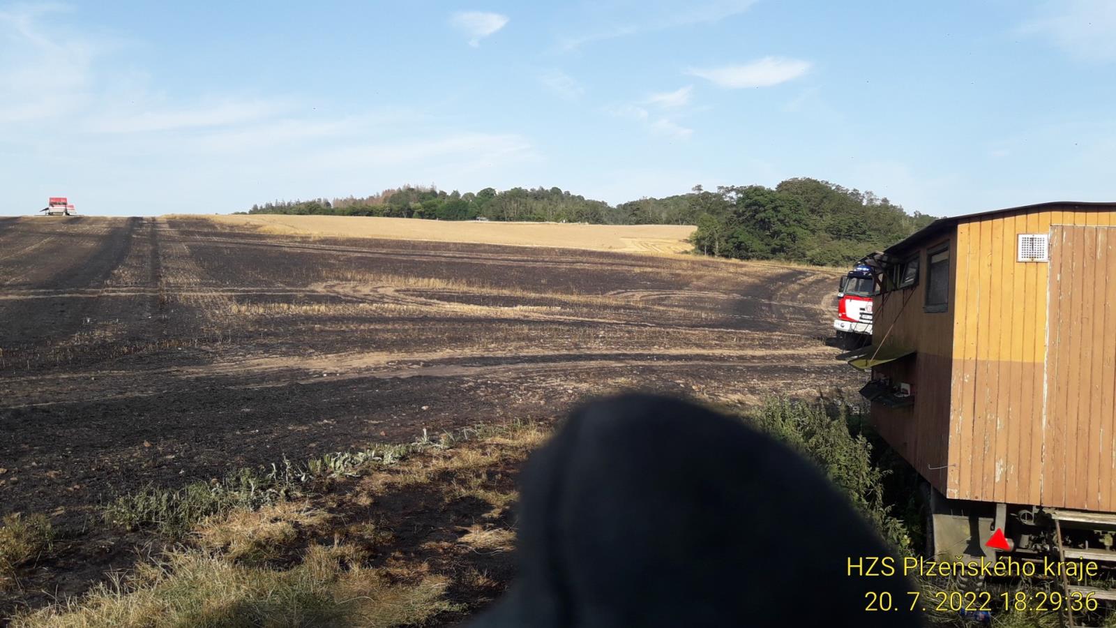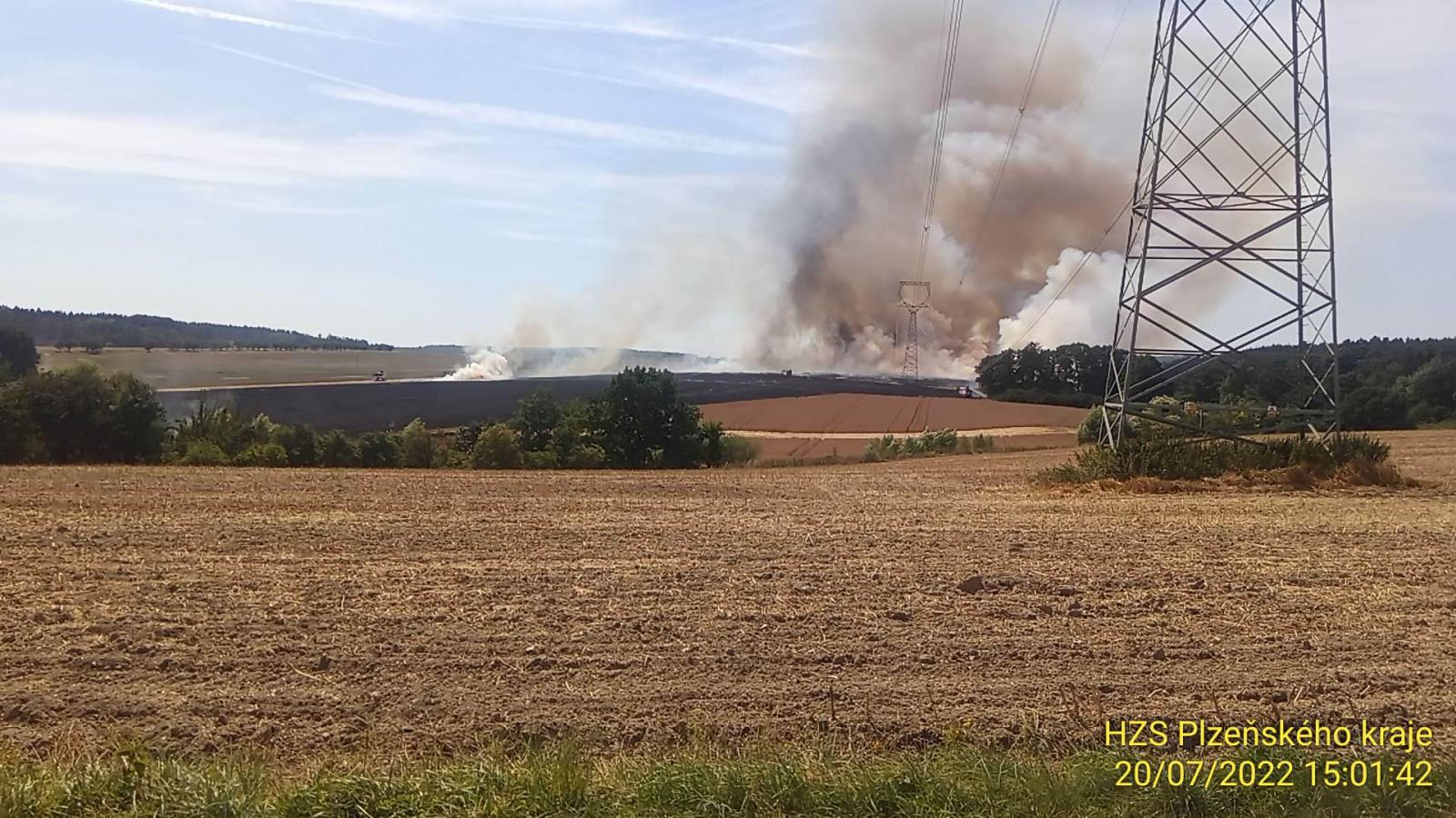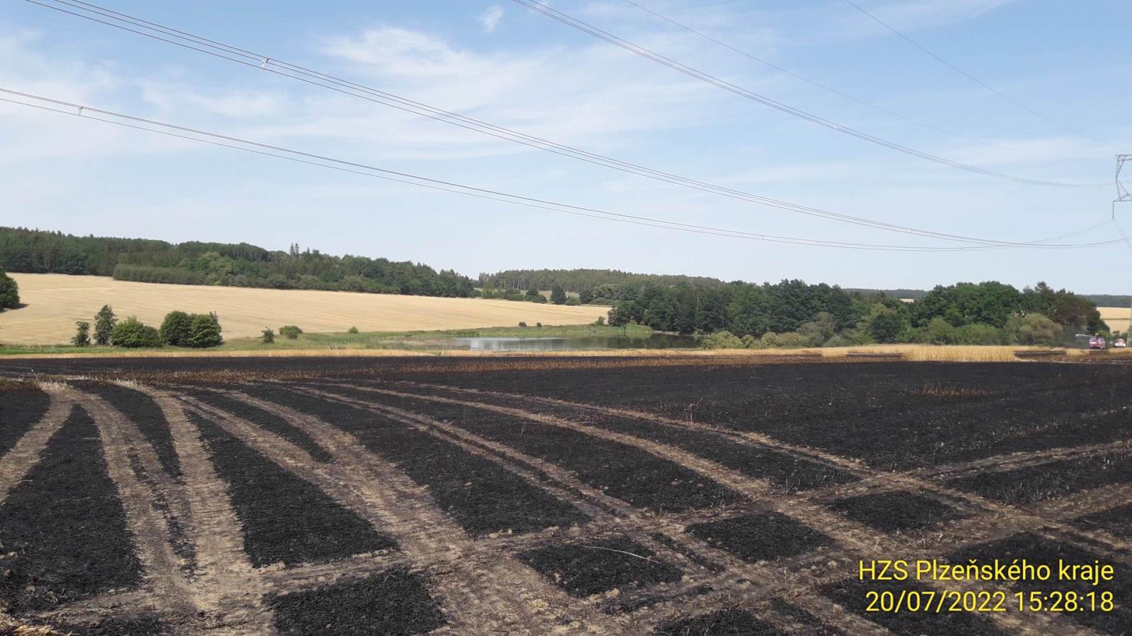 Druhým velkým požárem včerejšího dne byl požár pole s pšenicí nedaleko Nedražic. Oheň zasáhl plochu 18ha a způsobil škodu přes 1mil. Kč. Jeho příčinou byla technická závada na kombajnu. Zasahovalo devět jednotek hasičů.