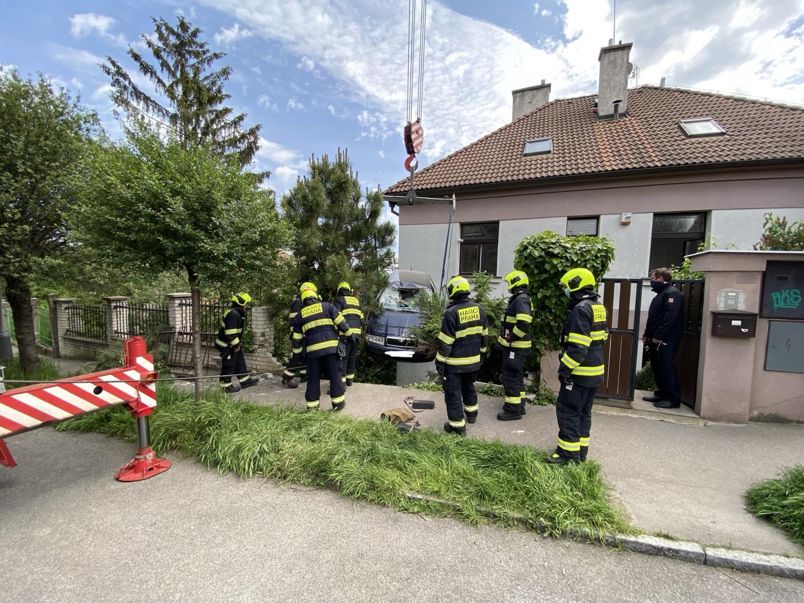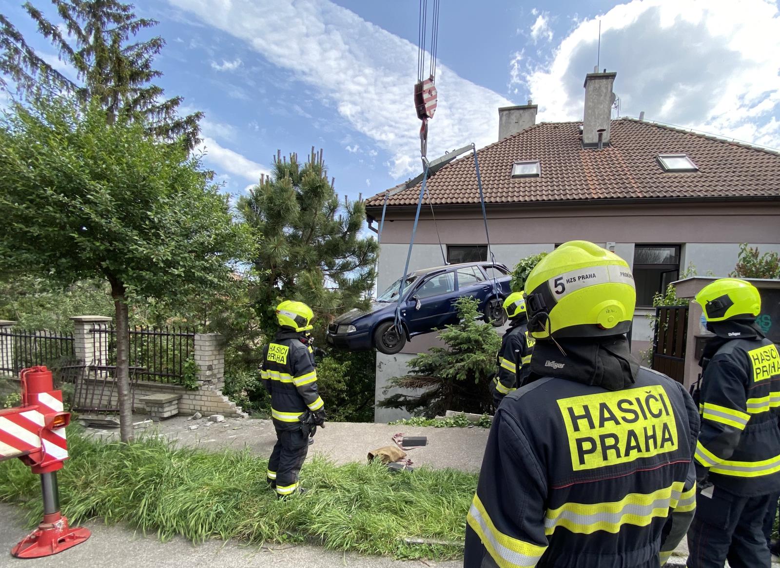 Auto, které sjelo ze silnice do domu v Praze 5, vyprostili hasiči jeřábem