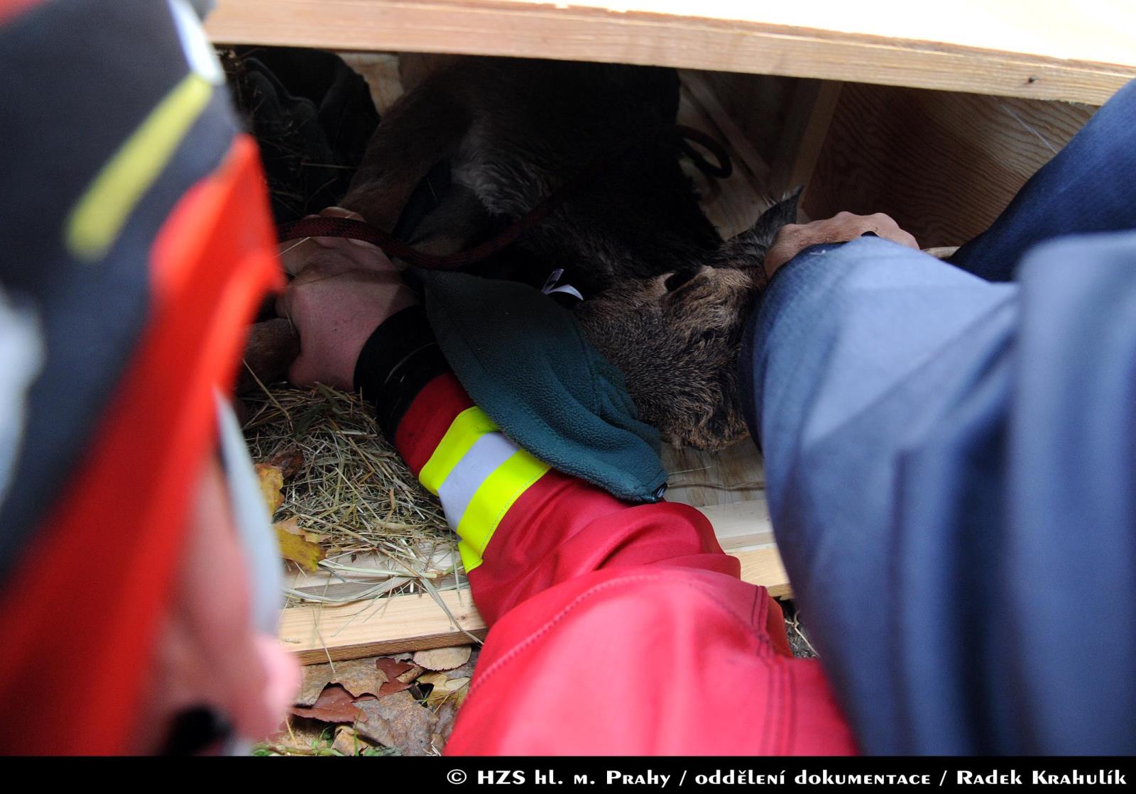 Hasiči odchytili mladého daňka, který uvízl v Praze pod Mostem Legií