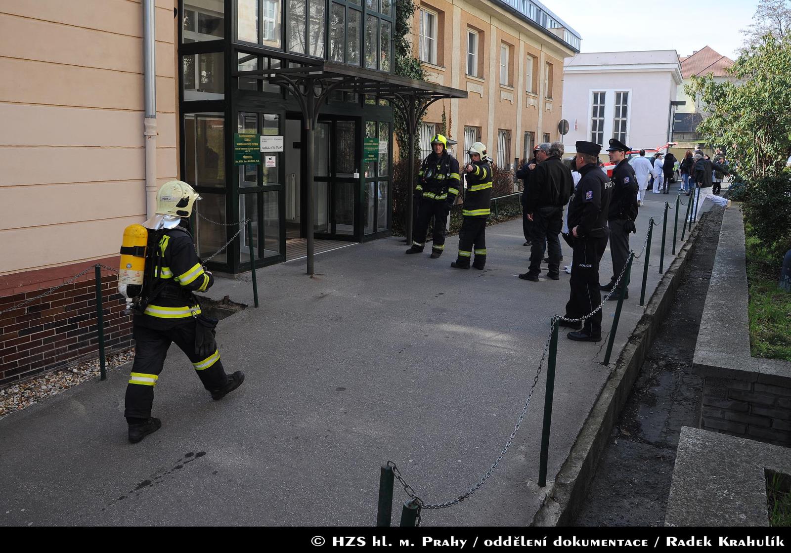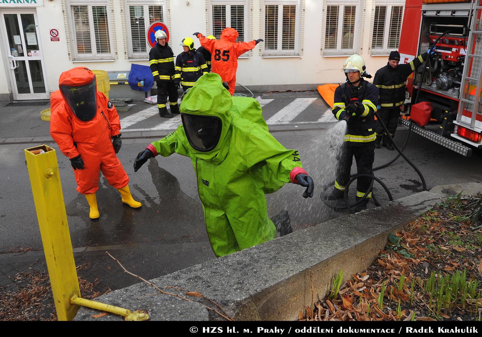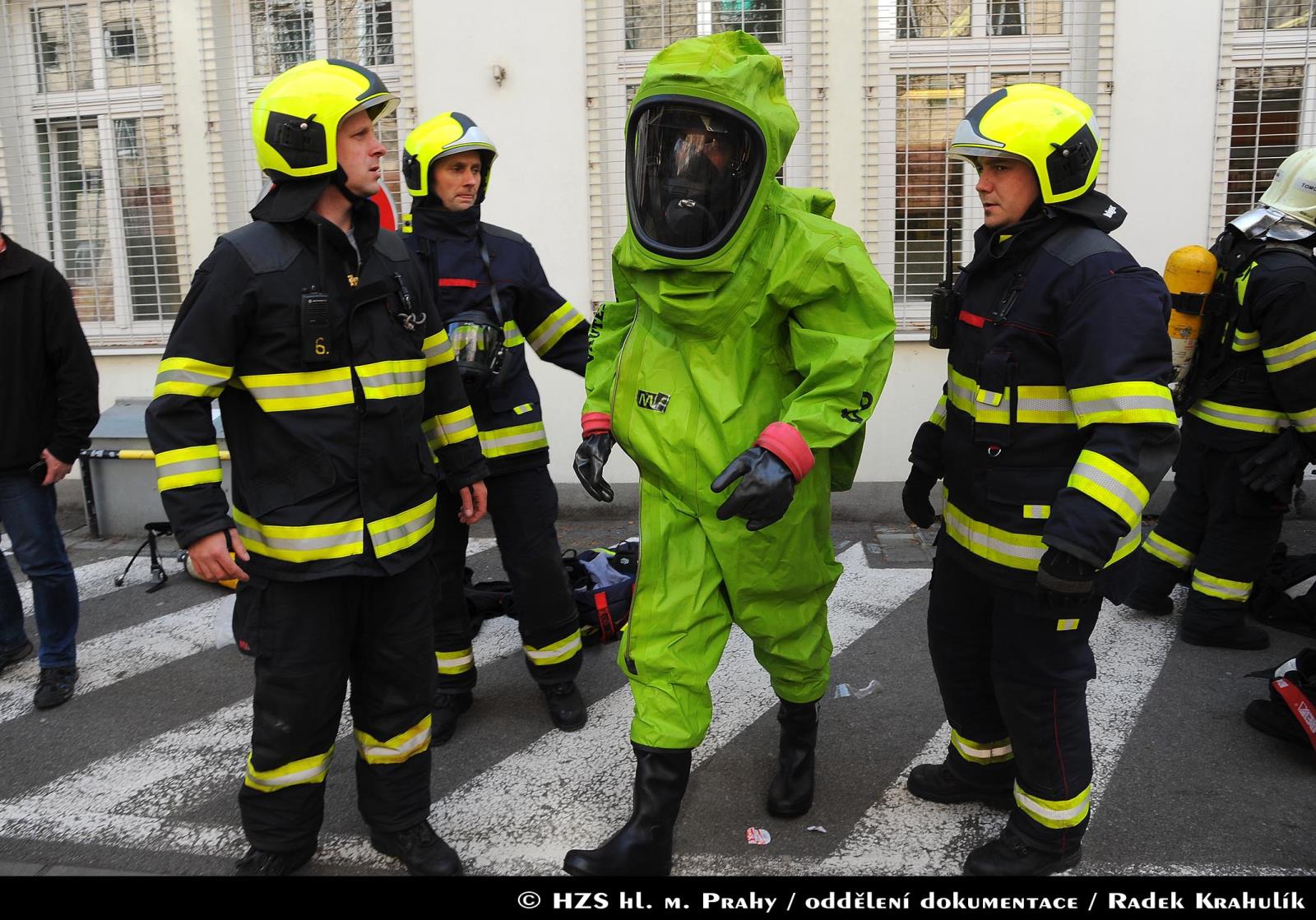 Na místo postupně dorazily jednotky z centrální stanice, Strašnic, Holešovic, Krče a Petřin, mezi nimi i speciální chemický tým vybavený pro manipulaci s nebezpečnými látkami. Podle informací z místa události se zdroj úniku nacházel ve skříni, která byla následně hasiči vynesena z budovy a zajištěna.