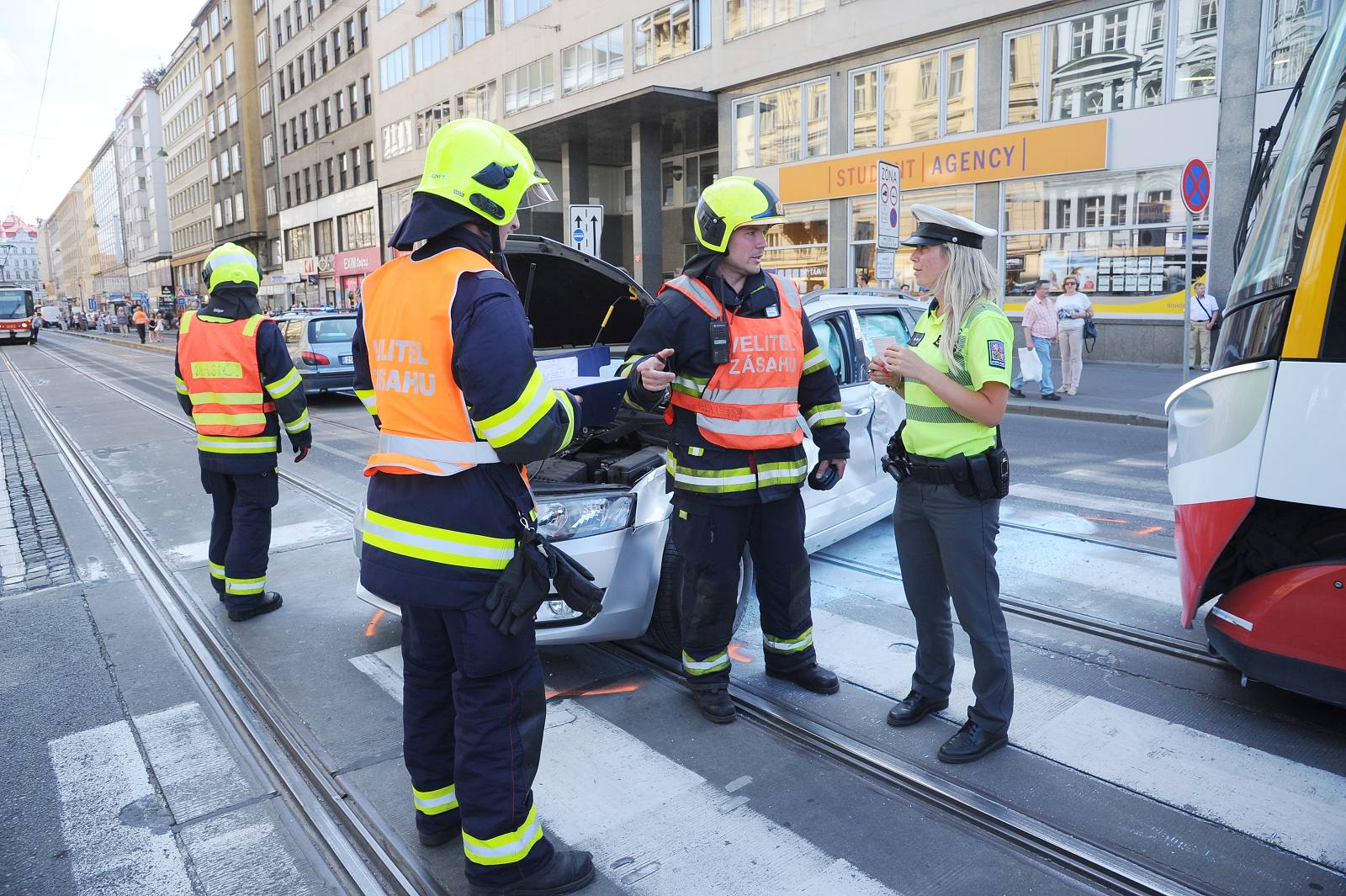 Hasiči ze tří jednotek zasahovali u nehody tramvaje a osobního auta v centru Prahy