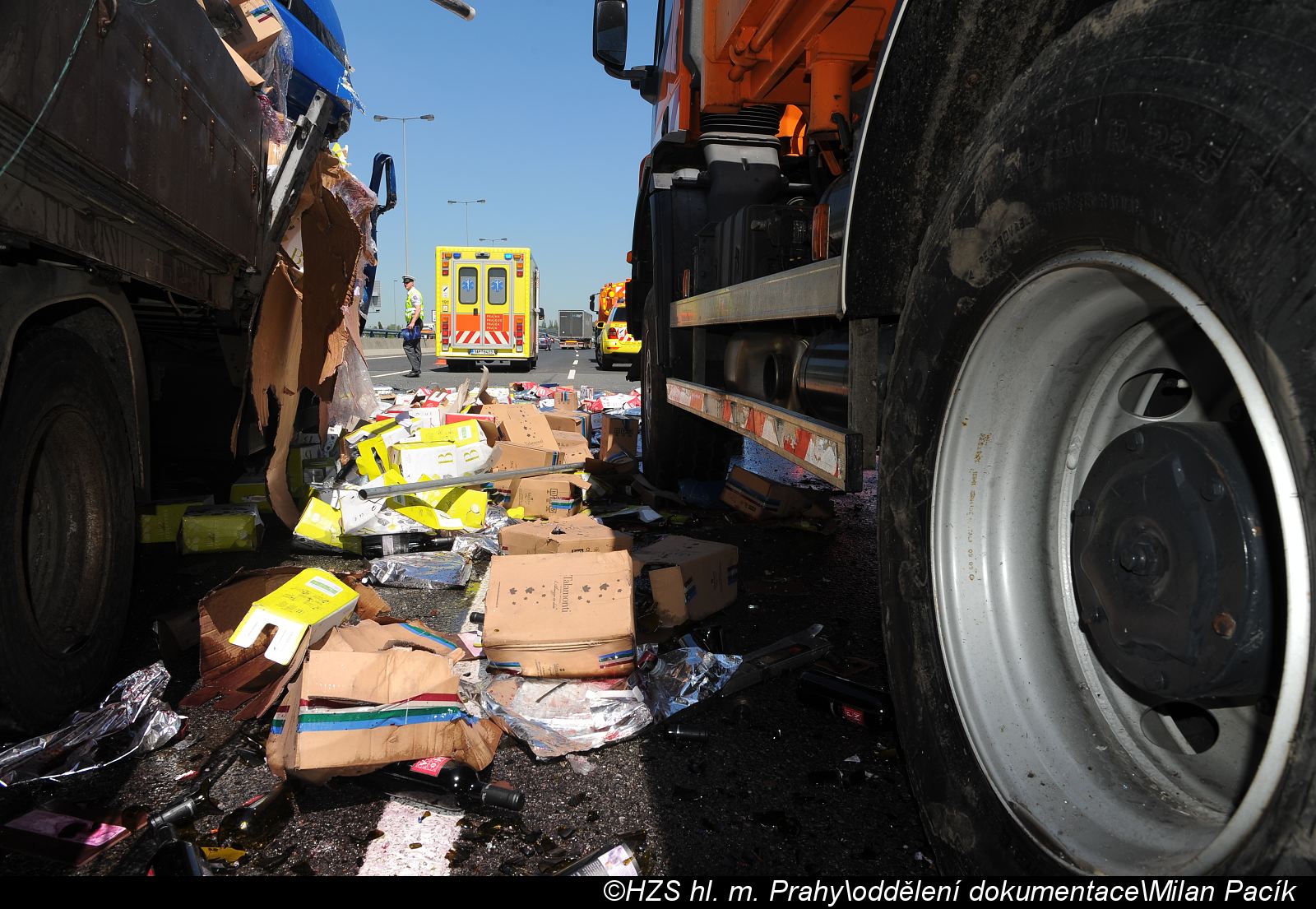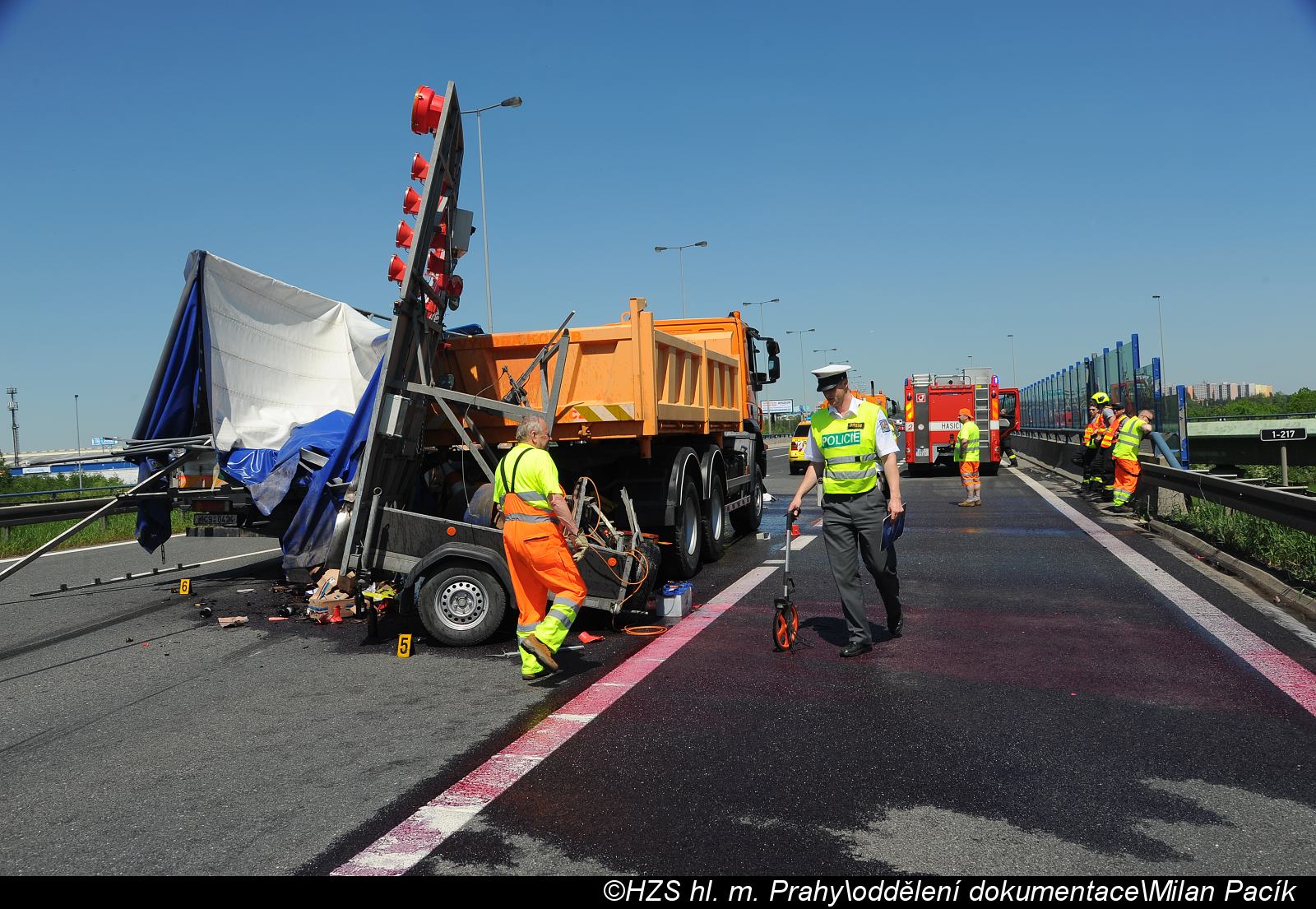 Zaklíněného řidiče kamionu vyprostili před příjezdem hasičů pracovníci údržby silnic. Hasiči provedli protipožární zajištění nehody a úklid vozovky. Následně asistovali Policii ČR při zadokumentování nehody. Na místě zasahovala i ZZS hl. m. Prahy.