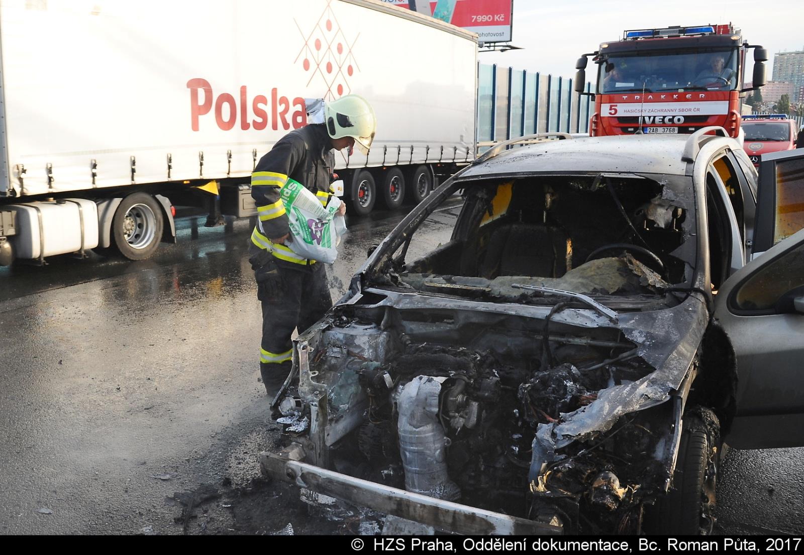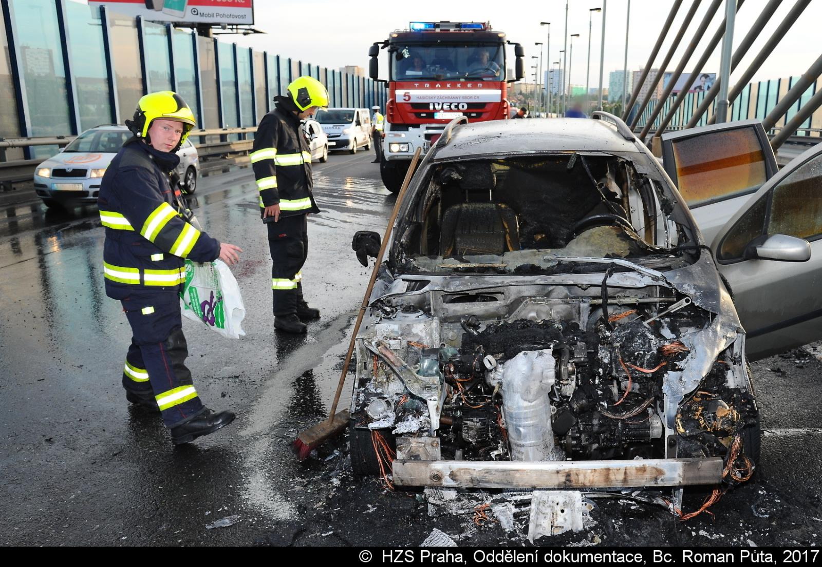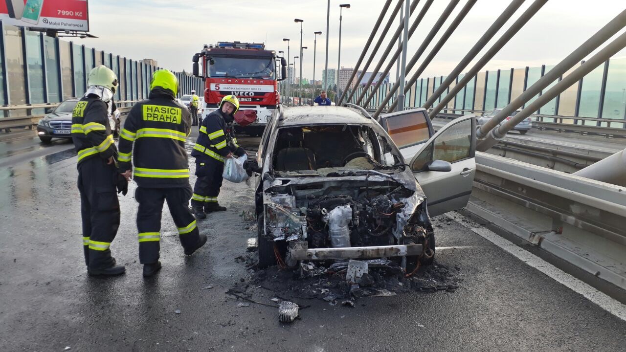 Na Jižní spojce včera večer hořel osobní automobil, silnice ve směru na Černý most byla v době zásahu neprůjezdná