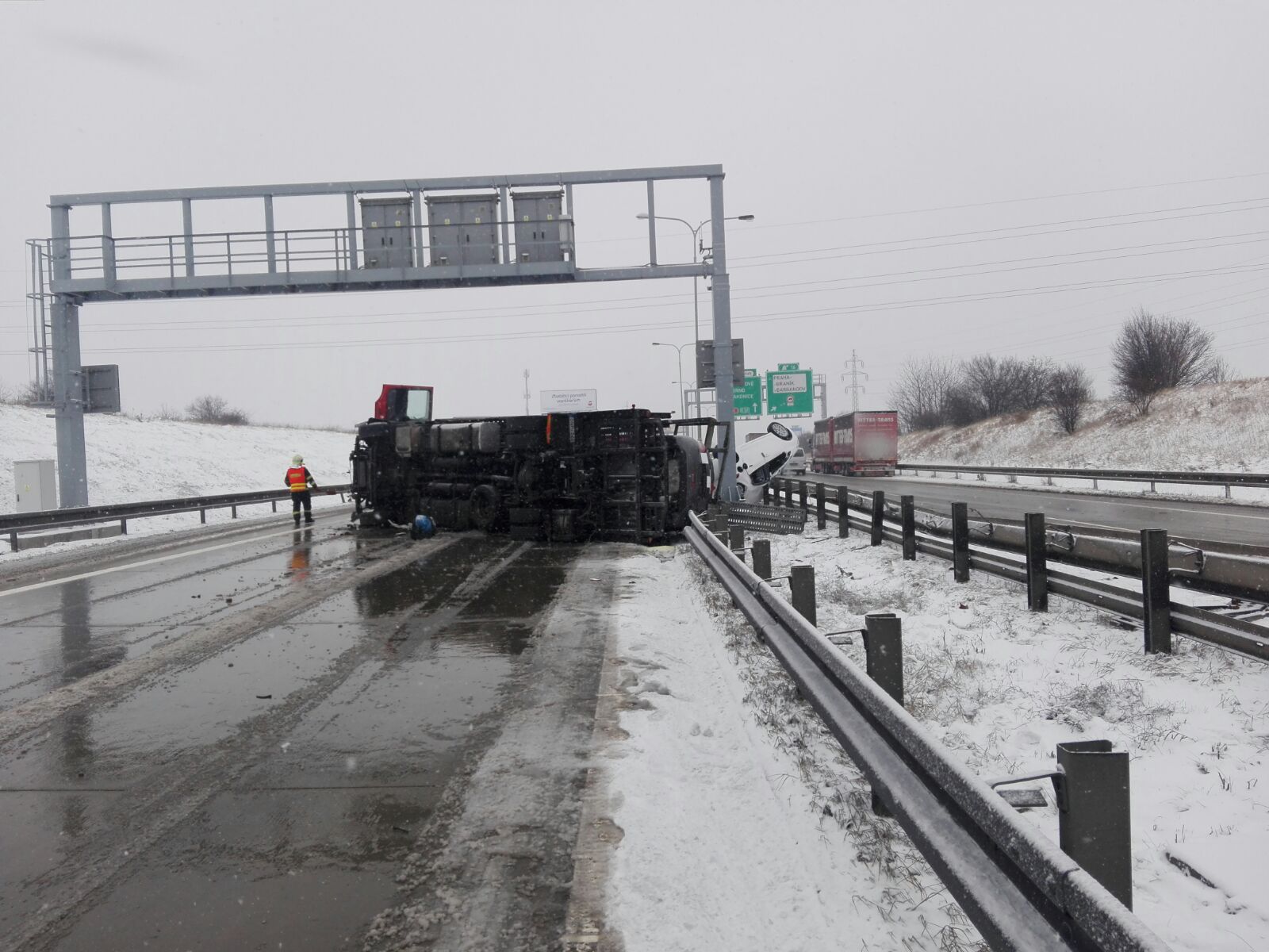 Jednotka hasičů z radotína zasahovala dne 17.03.2018 od 9:08 hodin na Pražském okruhu ve směru na Plzeň, za nájezdem od Barrandova. Převrátil se tam na bok kamion, který převážel osobní vozidla.