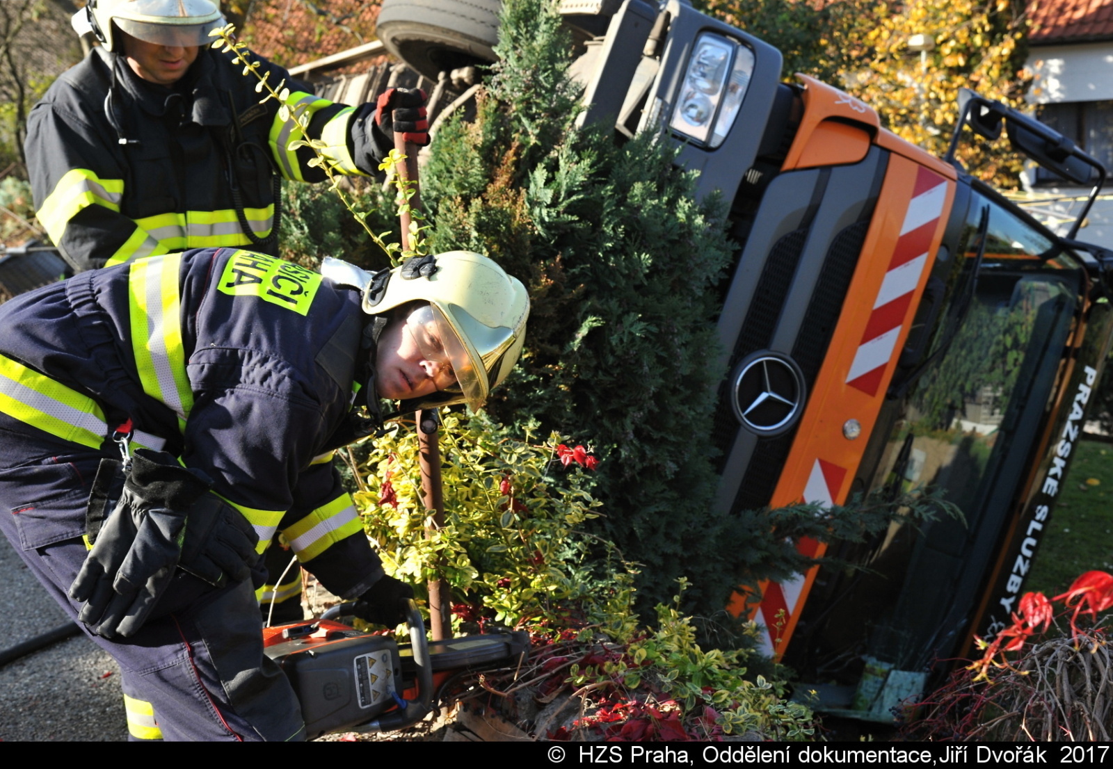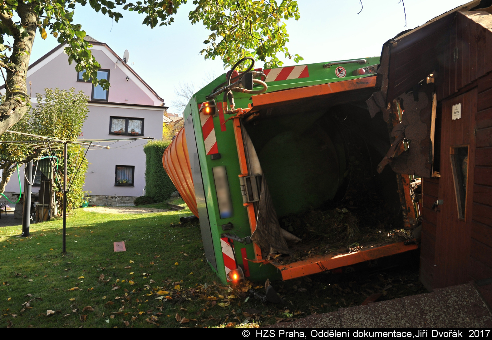 Popelářské auto bez řidiče se v úterý odpoledne převrátilo v pražské čtvrti Ruzyně do zahrady rodinného domu.Převrácený popelářský vůz zaměstnal hasiče do noci