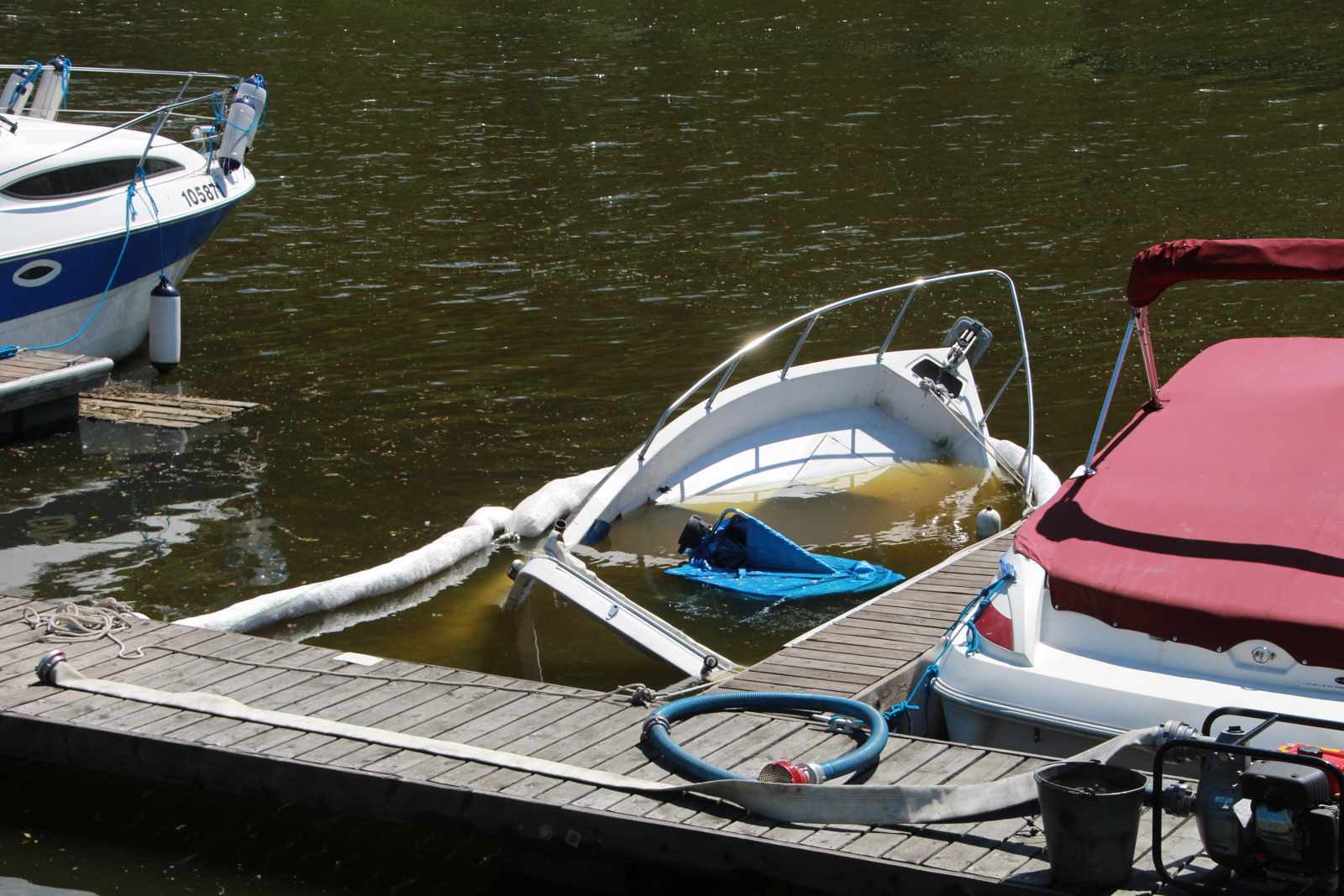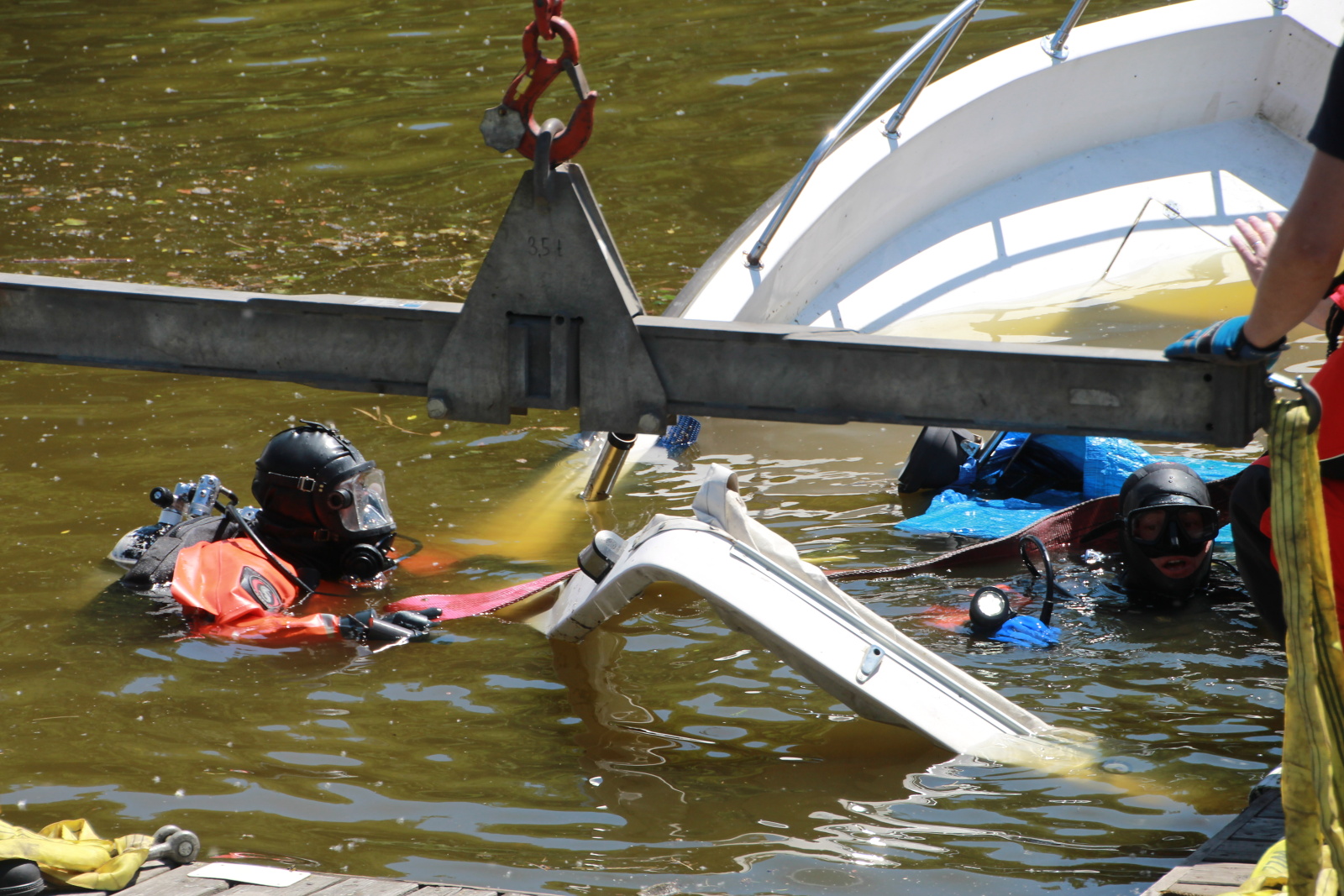 V době příjezdu hasičů bylo asi šestimetrové plavidlo už téměř potopené a nad hladinu vyčuhovala jen část přídě. Hasiči loď přivázali k molu, aby zamezili dalšímu klesání ke dnu. Pak byl člun prohlédnut policejním a hasičským potápěčem, zda se v něm nenachází nějaká osoba.