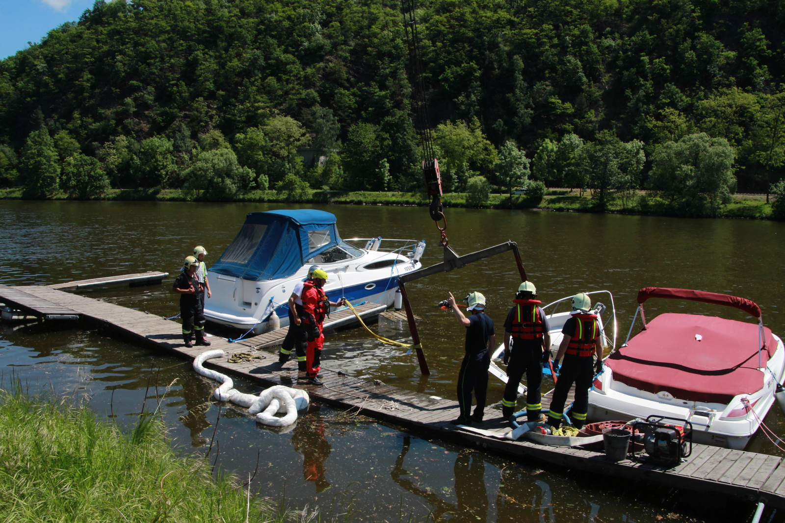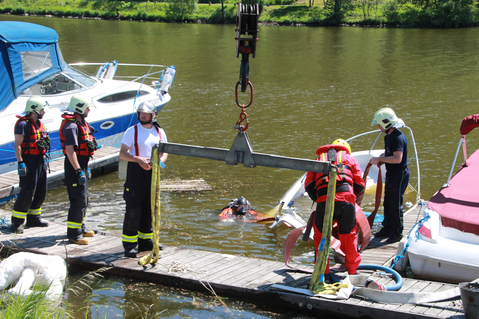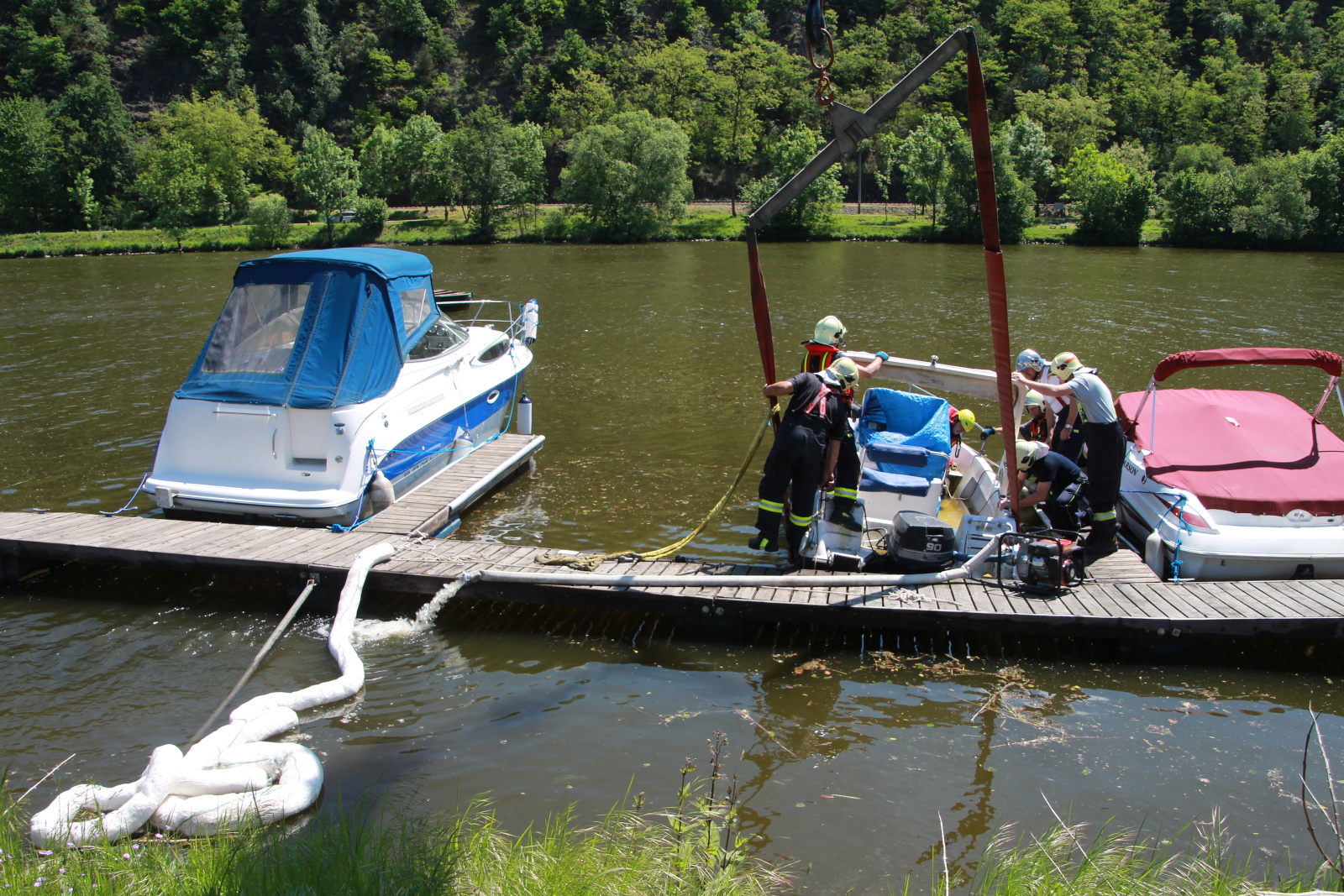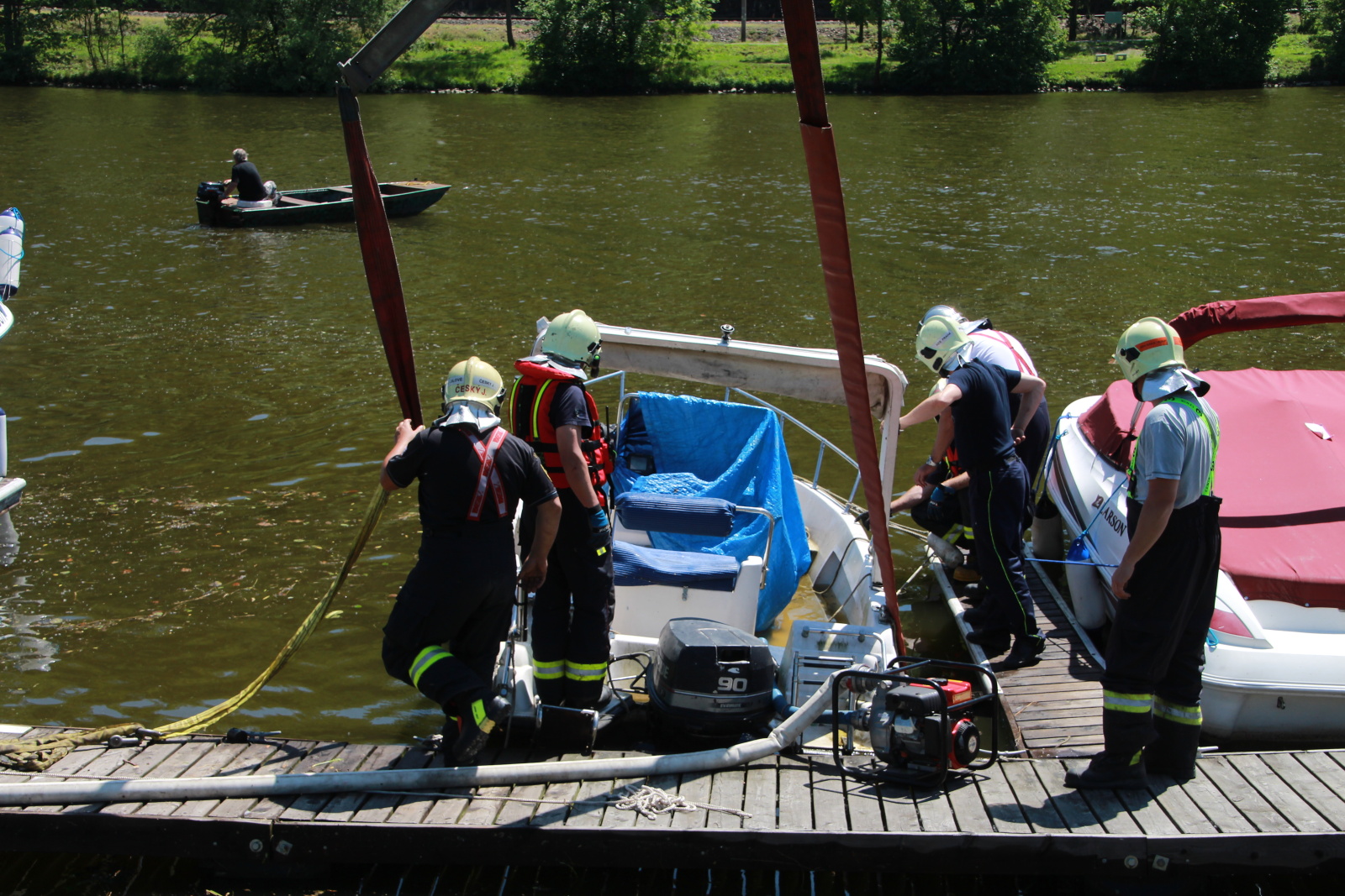 Následně byla loď vyvázána k rameni jeřábu vyprošťovacího automobilu a lehce nadzvednuta, aby mohlo dojít k odčerpání vody kalovým čerpadlem z prostoru paluby. Nakonec byl člun vytažen na břeh a předán majiteli.