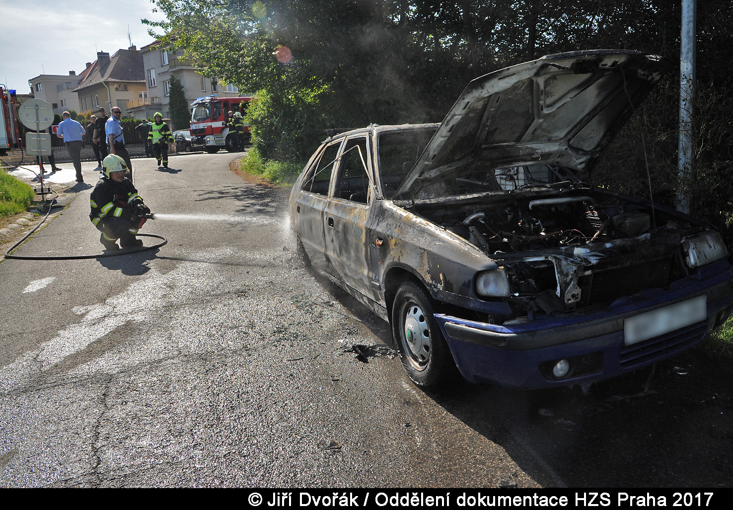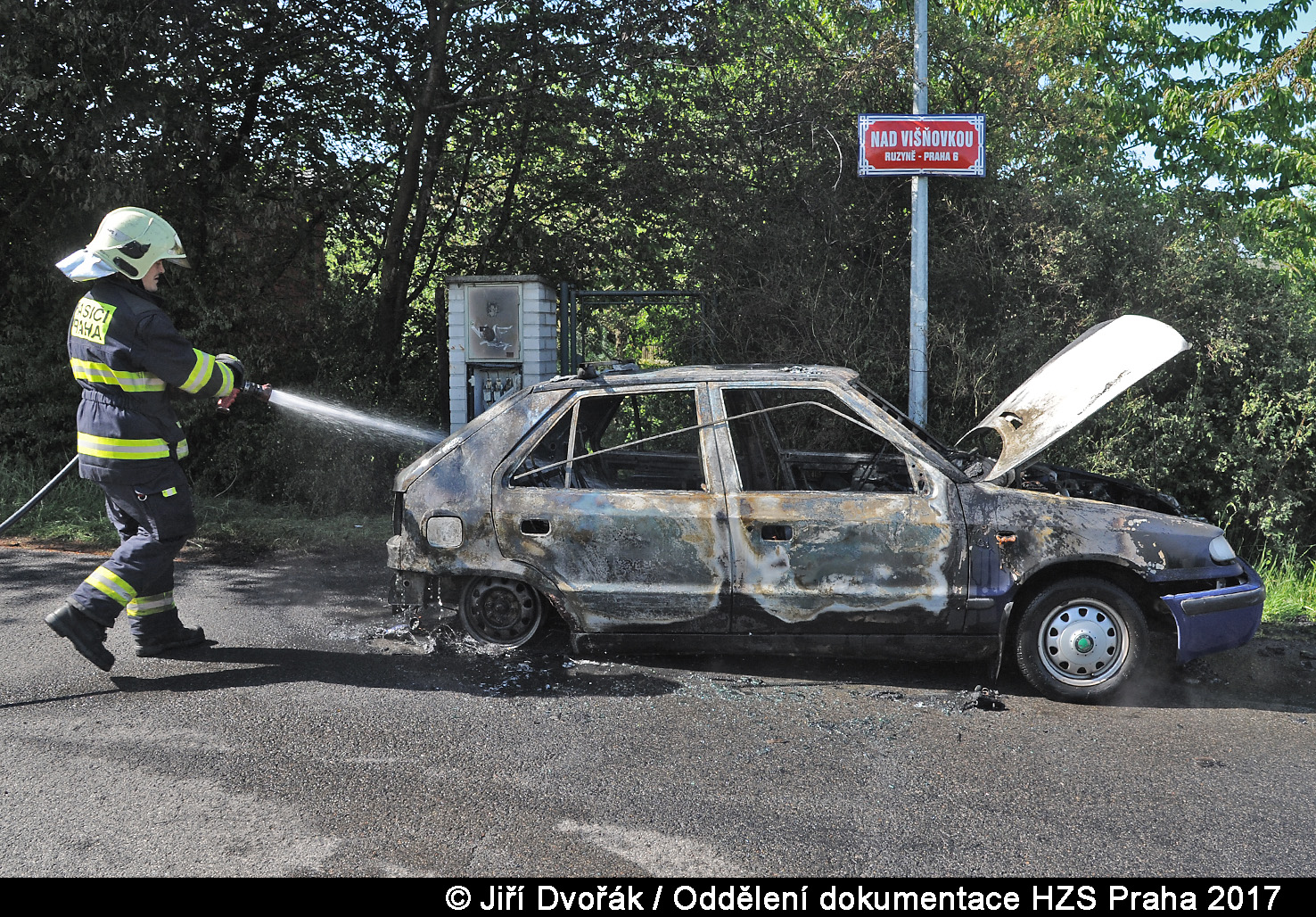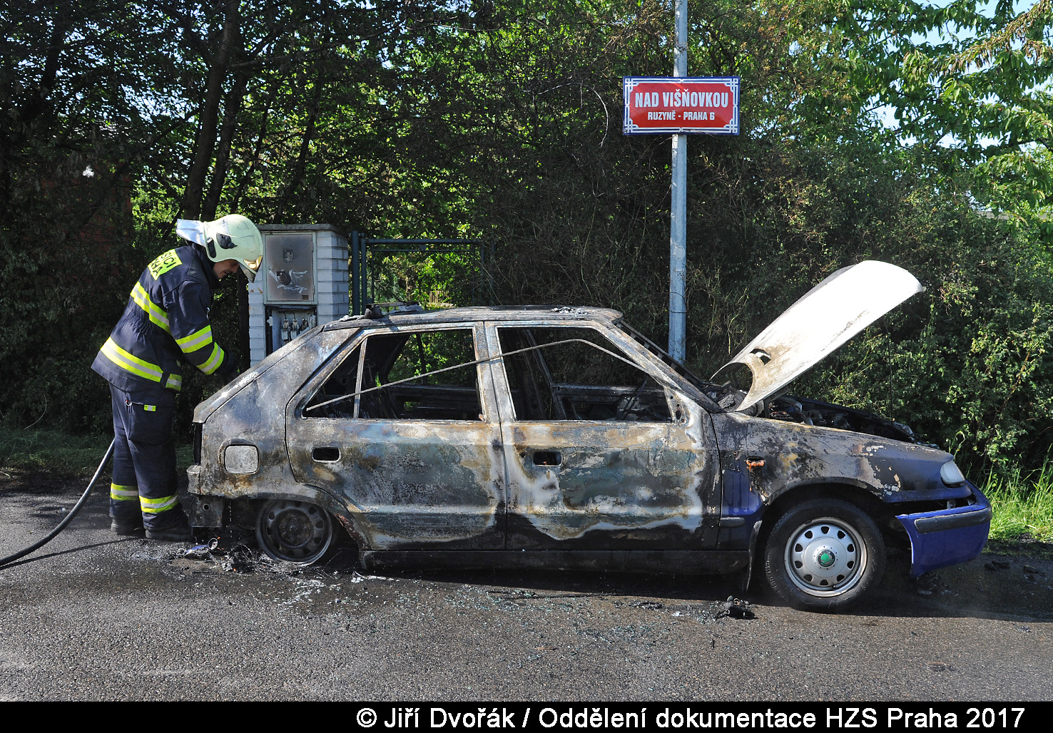 V ulici Nad Višňovkou v pražské Ruzyni zasahovali v pondělí 29.05.2017 od 09:24 hodin hasiči z Petřin u požáru osobního vozidla na pohon LPG. V době příjezdu byl automobil zasažen plamenným hořením v plném rozsahu. Hasiči na likvidaci požáru použili vysokotlakou vodu v dýchací technice.