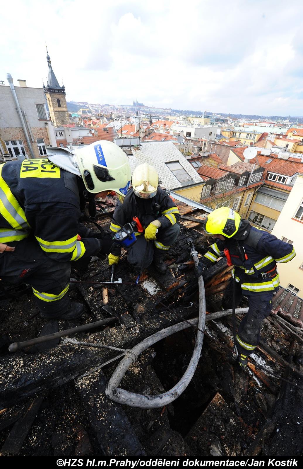 Plameny se rozšířily do izolace střechy v podkroví a částečně i na střešní konstrukci. Hasiči museli rozebrat část střešní krytiny na ploše 5 x 5 metrů a vyhledávat pomocí termokamery skrytá ohniska. Na lokalizaci požáru hasiči použili 2 C proudy a speciální zařízení COBRA. Část hasebního zásahu byla vedena pomocí výškové techniky z ulice Žitná, kde byl blokován provoz.
