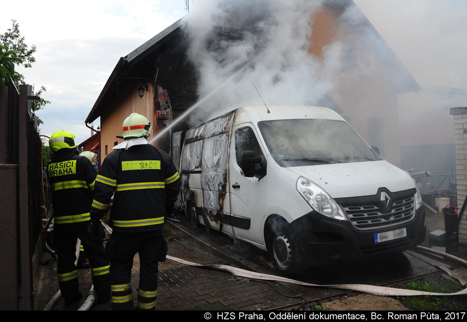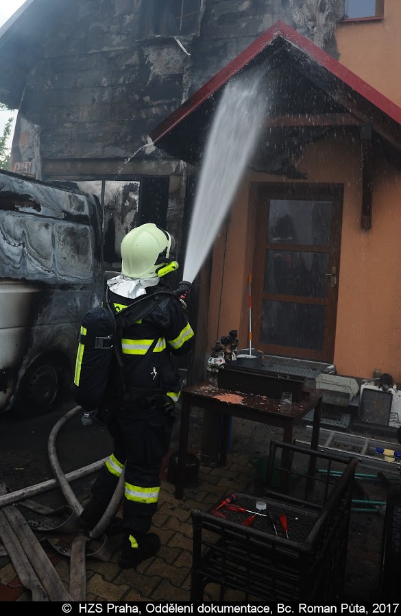 K požáru došlo v garáži domu, kde hořela dodávka. Plameny se rozšířily na fasádu a částečně zasáhly i do podkroví. Proto bylo také nasazeno speciální zařízení Cobra po automobilovém žebříku. Hasiči požár likvidovali 3 C proudy v dýchací technice vnitřkem budovy a z vnější strany domu. Během zásahu bylo z objektu postupně vyneseno několik tlakových lahví.