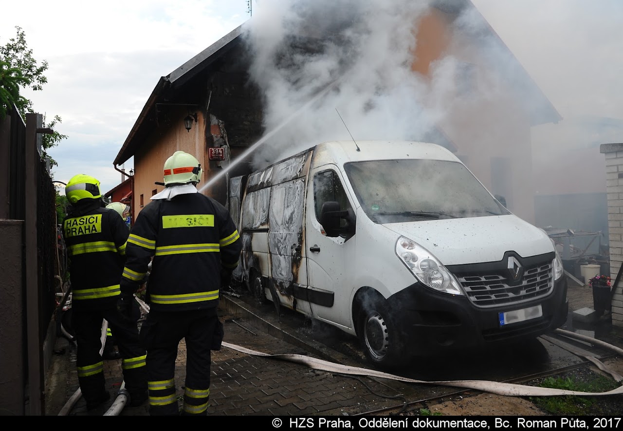 Požár dodávky v garáži rodinného domu v Újezdu nad Lesy se rozšířil po fasádě do podkroví