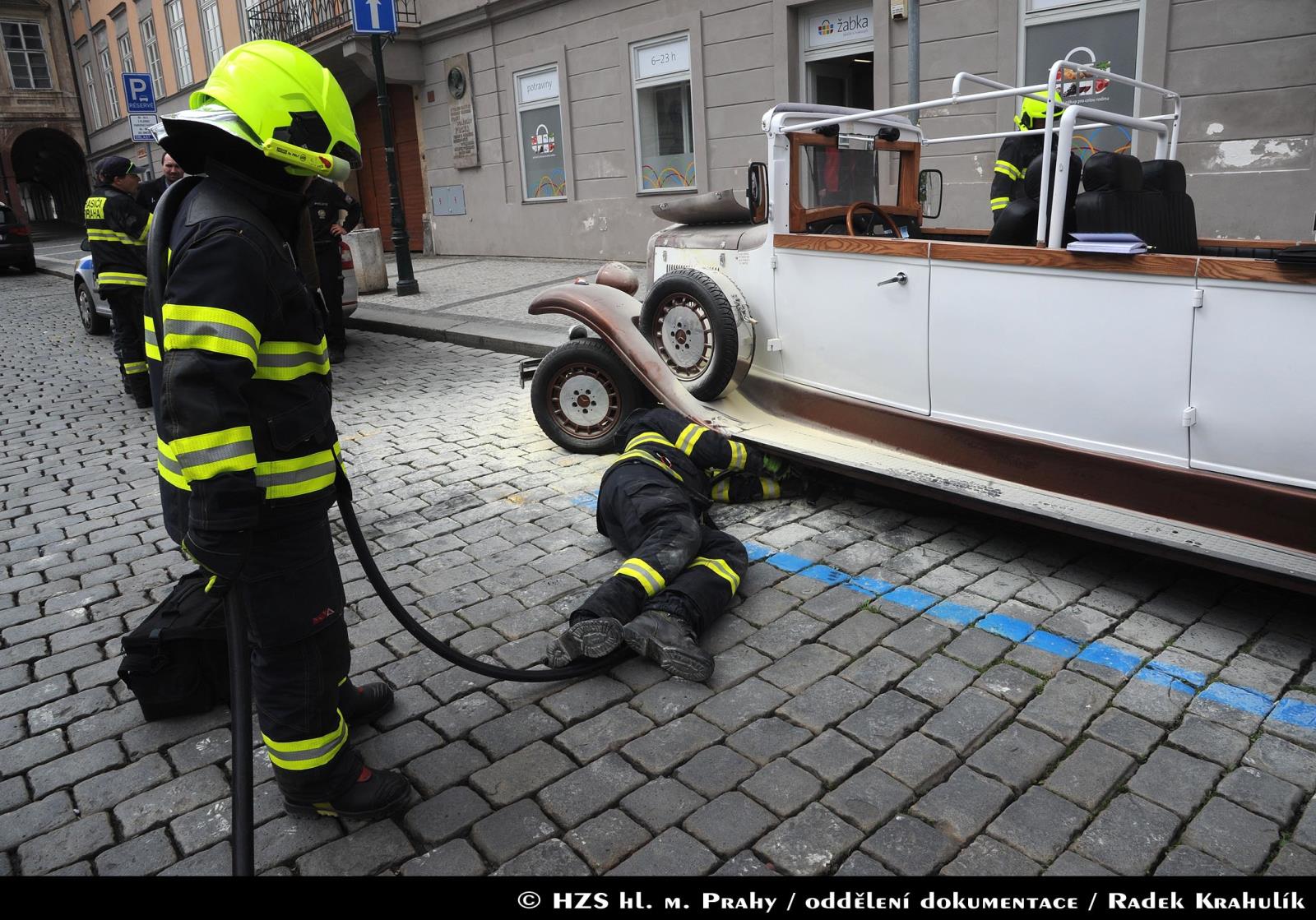 Požár kopie historického vozidla Mercedes v centru Prahy nezpůsobil větší škodu