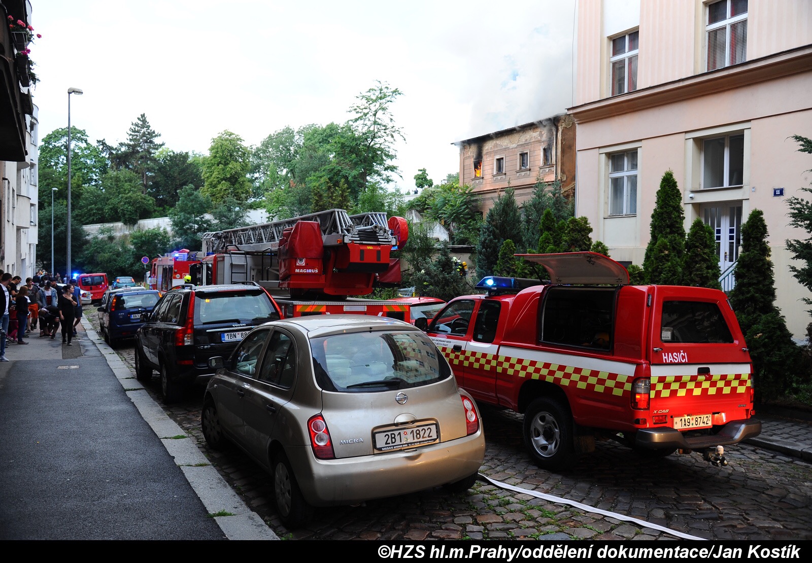 V ulici Košická v pražských Vršovicích zasahovaly od 19:38 hodin dne 15.07.2017 dvě profesionální a jedna dobrovolná jednotka u požáru ve druhém patře neobydleného domu.