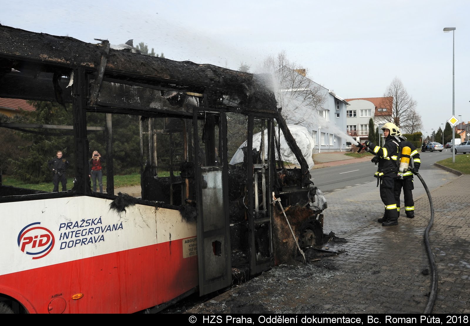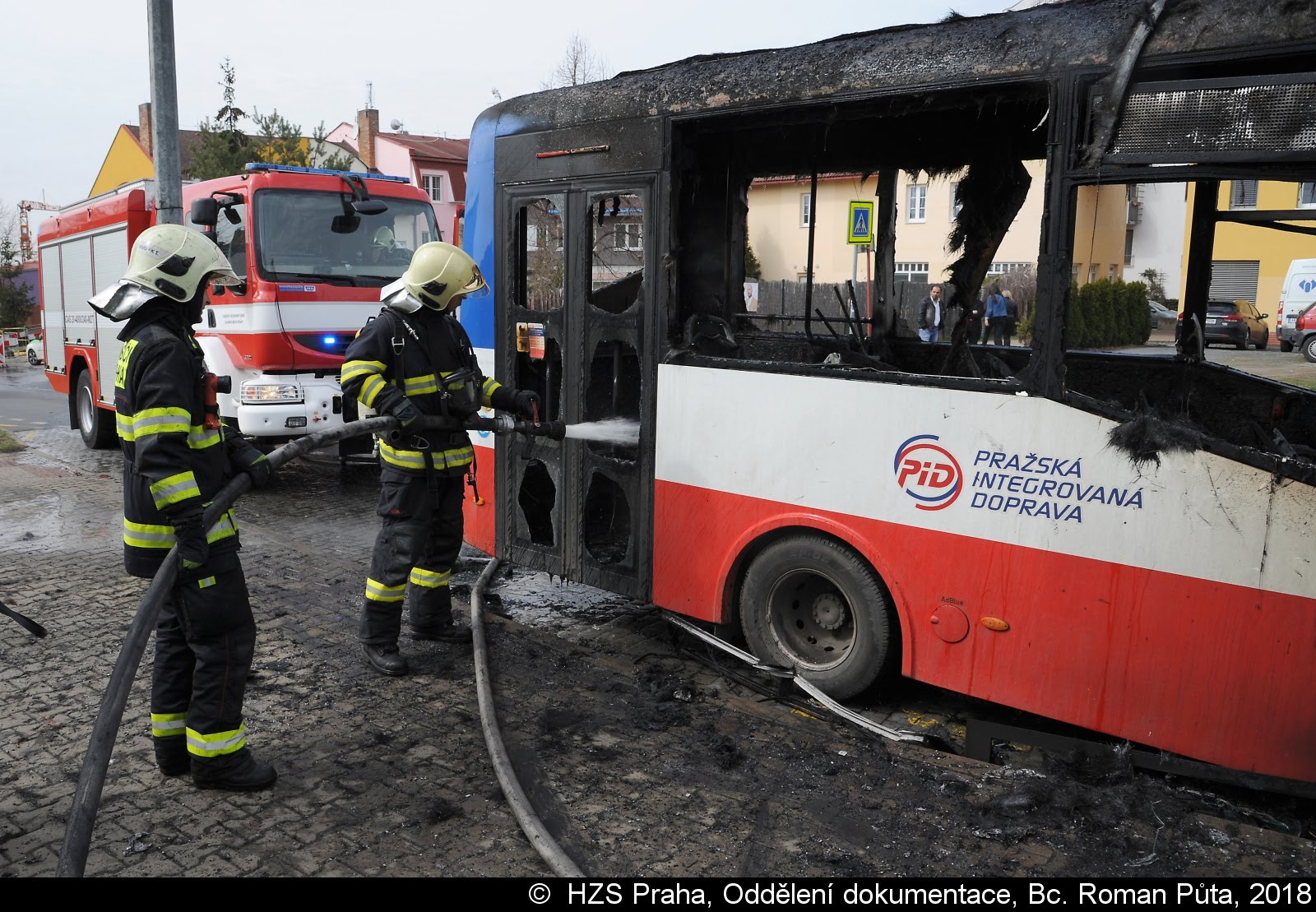 Dne 4.4.2018 zasahovali od 13:46 hodin hasiči ze satalické a strašnické stanice u požáru autobusu PID v ulici Pelušková v pražských Kyjích. Po příjezdu první jednotky na místo bylo zřejmé, že požárem je zasažen autobus v plném rozsahu.