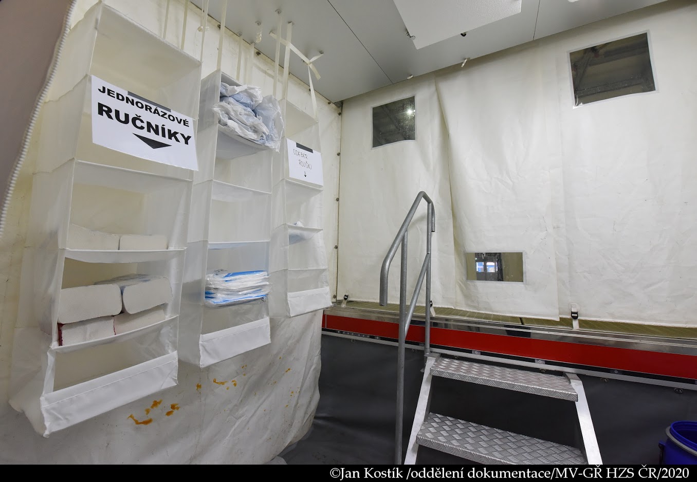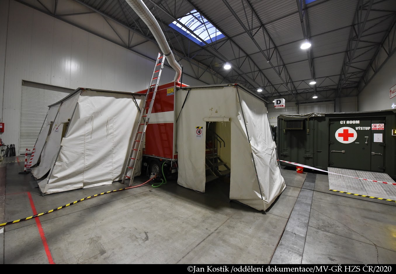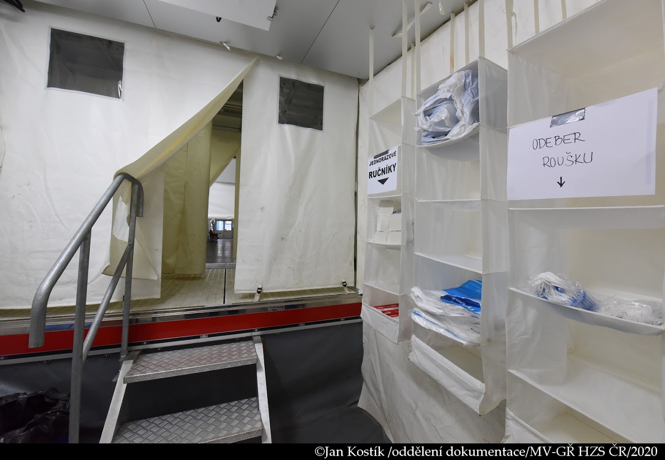 V polní nemocnici, která byla vybudována na výstavišti v pražských Letňanech, pomáhají i hasiči z HZS hl. m. Prahy. U výstupu z lůžkové části nemocnice jsme vybudovali stanoviště dekontaminace, které bude sloužit k očistě všech zdravotníků, pomocného personálu a také vybraného materiálu.