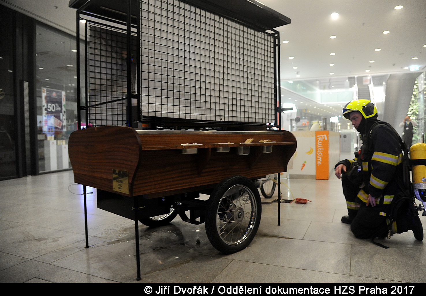 Hasiči vozík vytlačili před obchodní dům, aby zabránili větším škodám. Menší požár elektroinstalace byl rychle uhašen, škoda byla vyšetřovatelem odhadnuta na 20.000 korun.