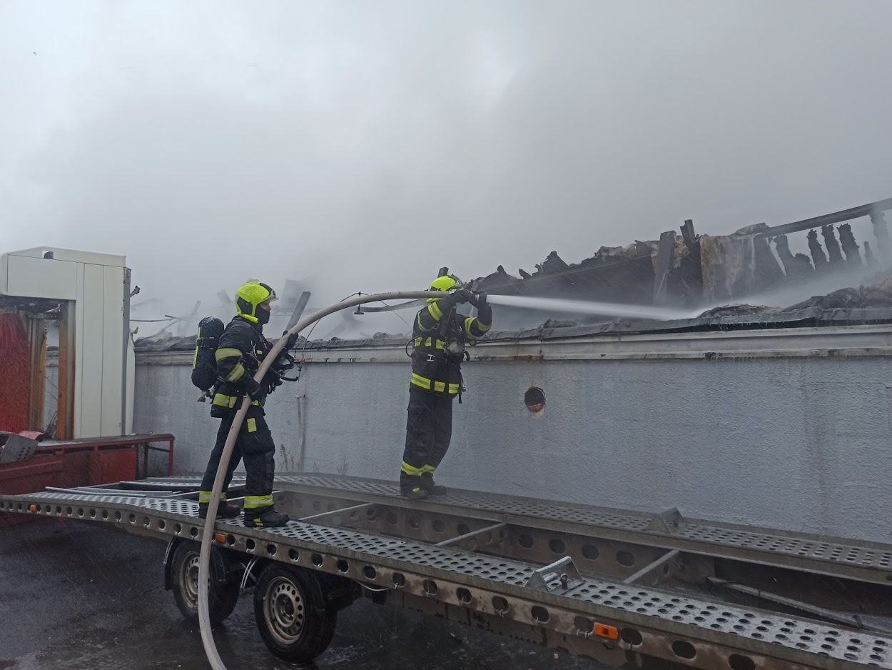 Plocha hořícího objektu, dlouhého 30 metrů a širokého 10 metrů, byla zasažena plameny v plném rozsahu. Situaci komplikoval rychlý propad střechy, který výrazně zvýšil riziko zásahu. Hasiči tak byli nuceni pracovat ve velice náročných podmínkách a nasadili hned šest vodních proudů C. Ochrana dýchacích cest byla nezbytná – každý zasahující hasič byl vybaven dýchací technikou, protože hustý kouř a toxické výpary z hořících materiálů a tlakových lahví představovaly bezprostřední nebezpečí.