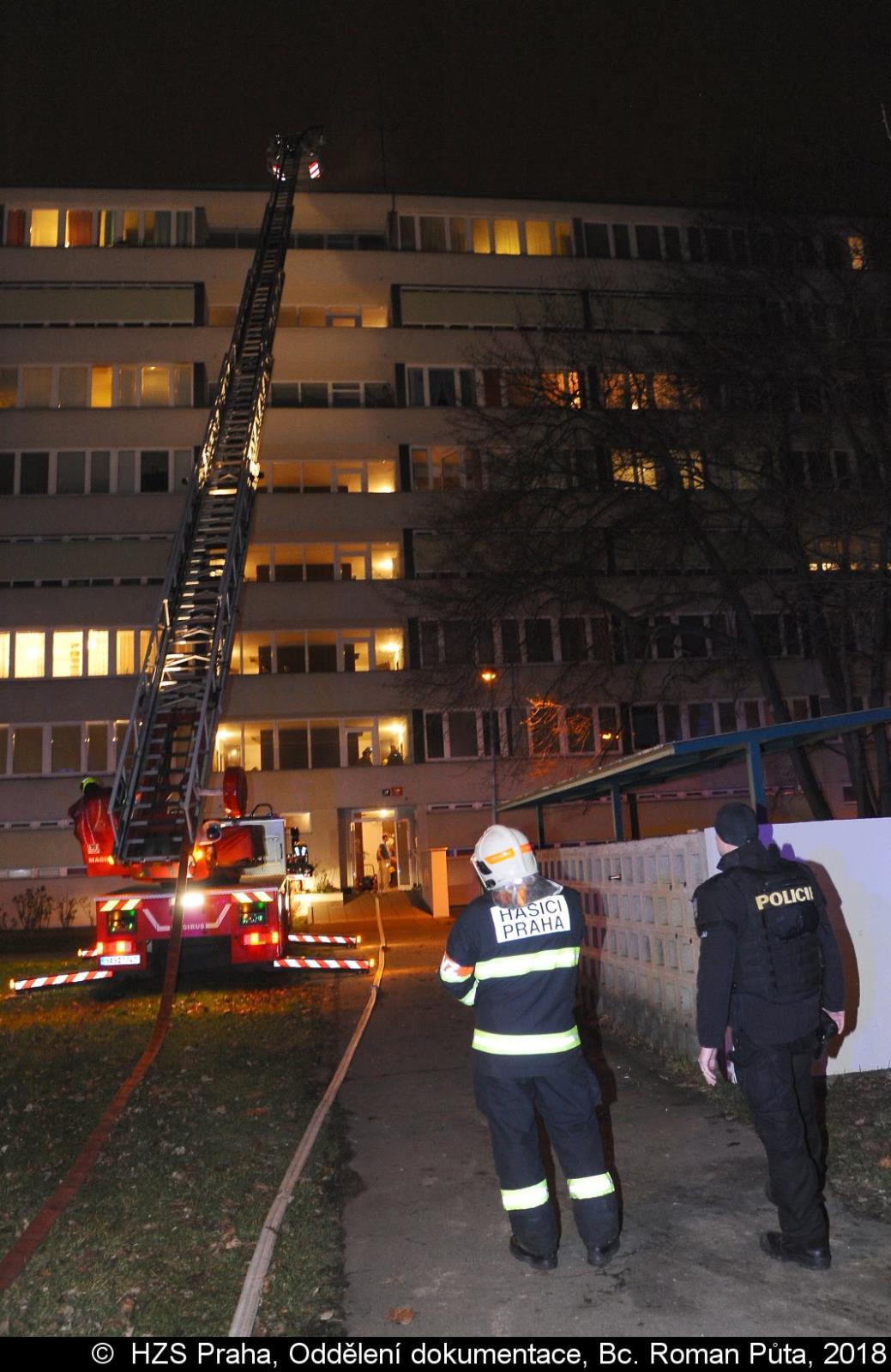 Jednotky požár dohasily pomocí 1 C proudu, zplodiny hoření však pronikly do vyšších pater chodby domu. Hasiči odvětrali dům pomocí přetlakové ventilace a evakuovali 26 osob. Průzkumem na střeše pomocí výškové techniky nebylo zjištěno rozšíření požáru. Příčinou vzniku požáru, který způsobil škodu 50.000 korun, byla nedbalost při přípravě potravin.