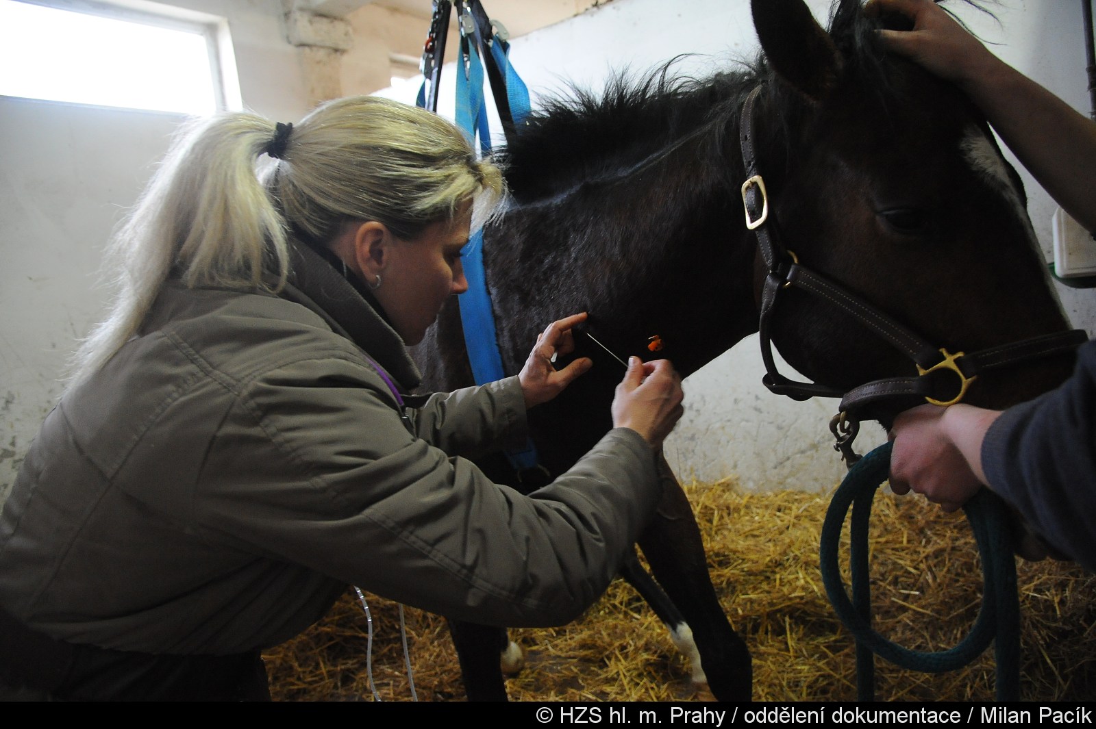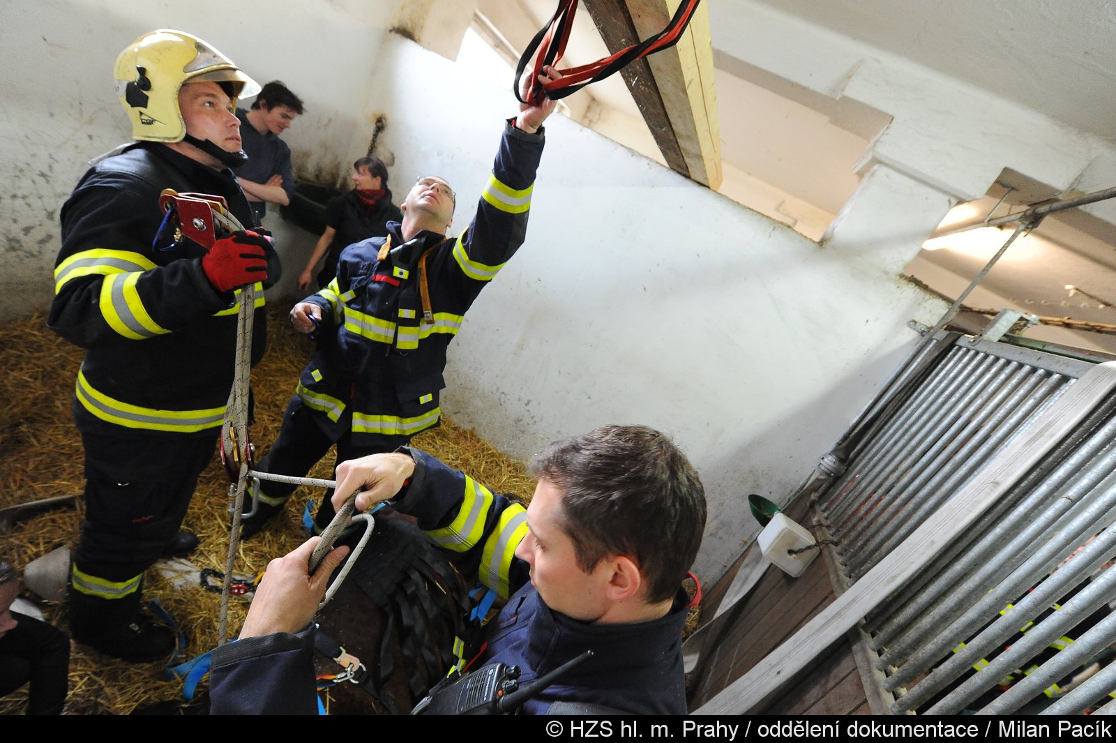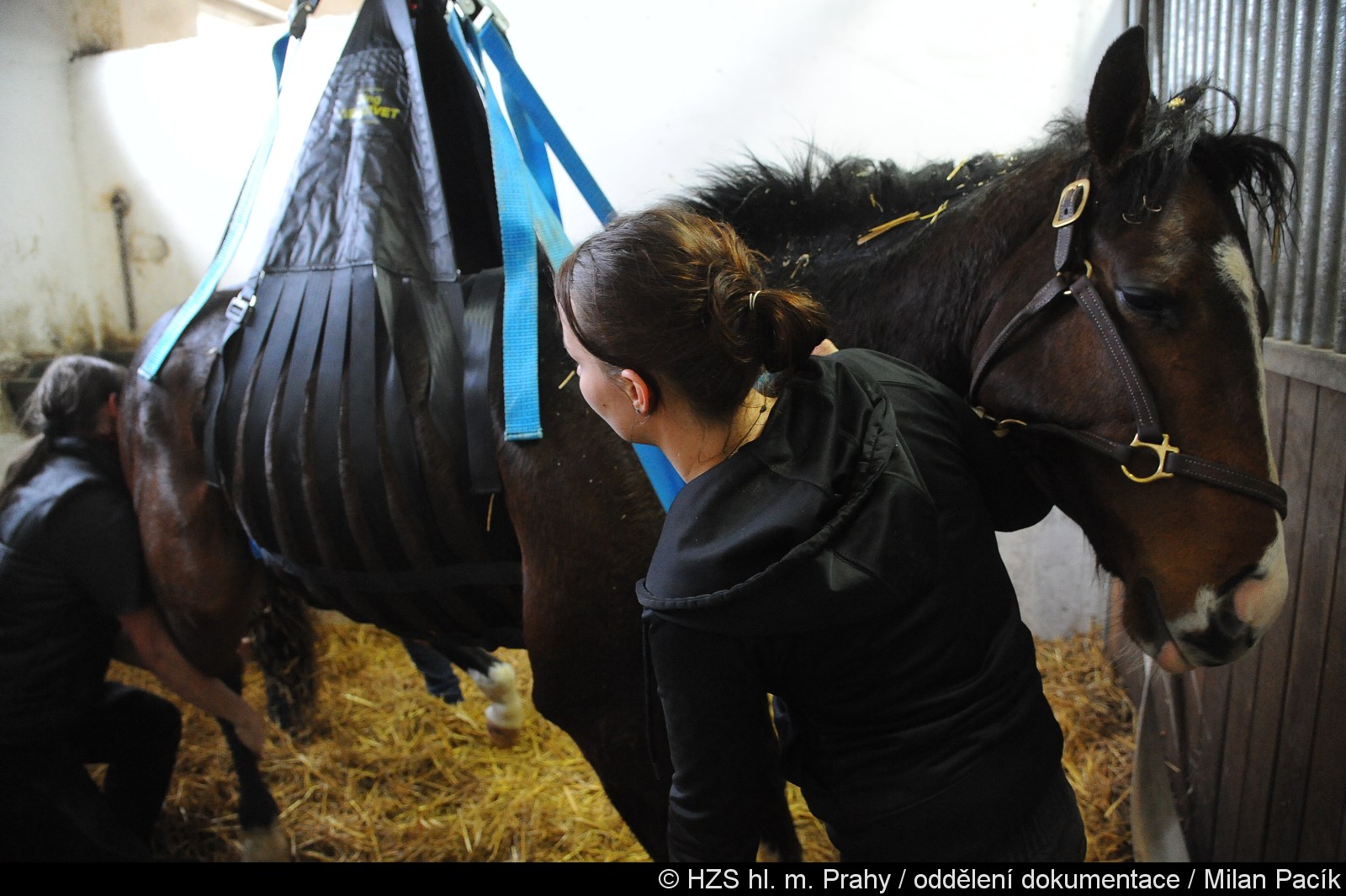 Hasiči z radotínské, smíchovské a strašnické stanice přijeli do areálu stáje, kde pod odborným dohledem veterináře zahájili zajištění zraněného zvířete. V průběhu zásahu byla nasazena speciální síť, která pomohla koně bezpečně podpořit a minimalizovat riziko dalšího poranění.