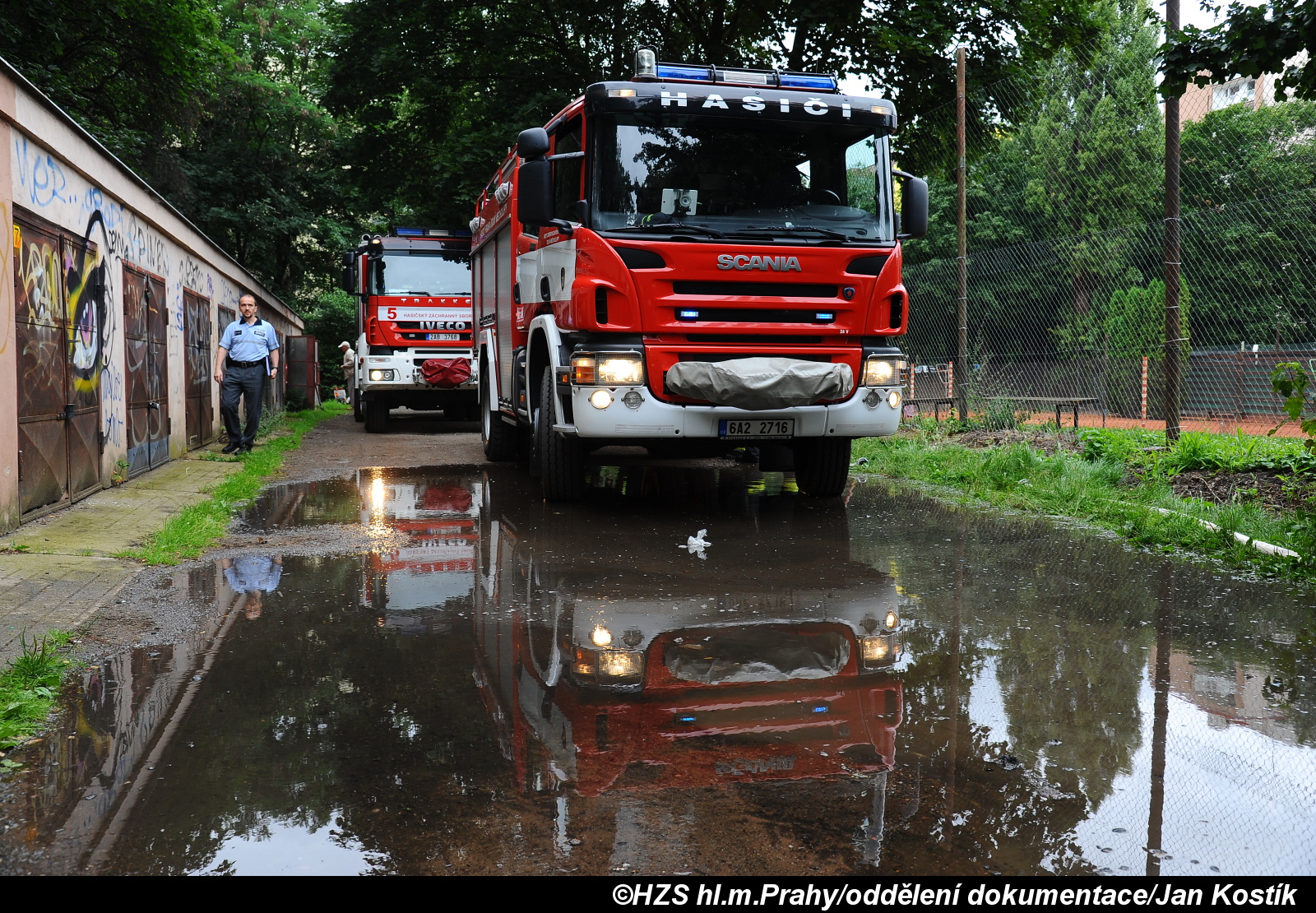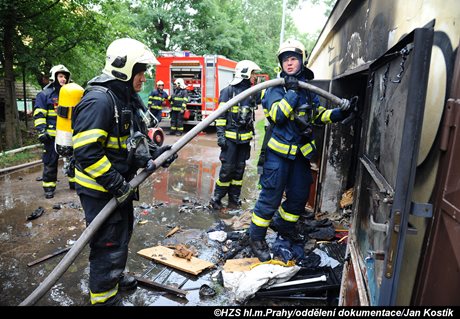 Profesionální a dobrovolní hasiči zasahovali u požáru garáže v Praze -Krči, kterou obývají bezdomovci