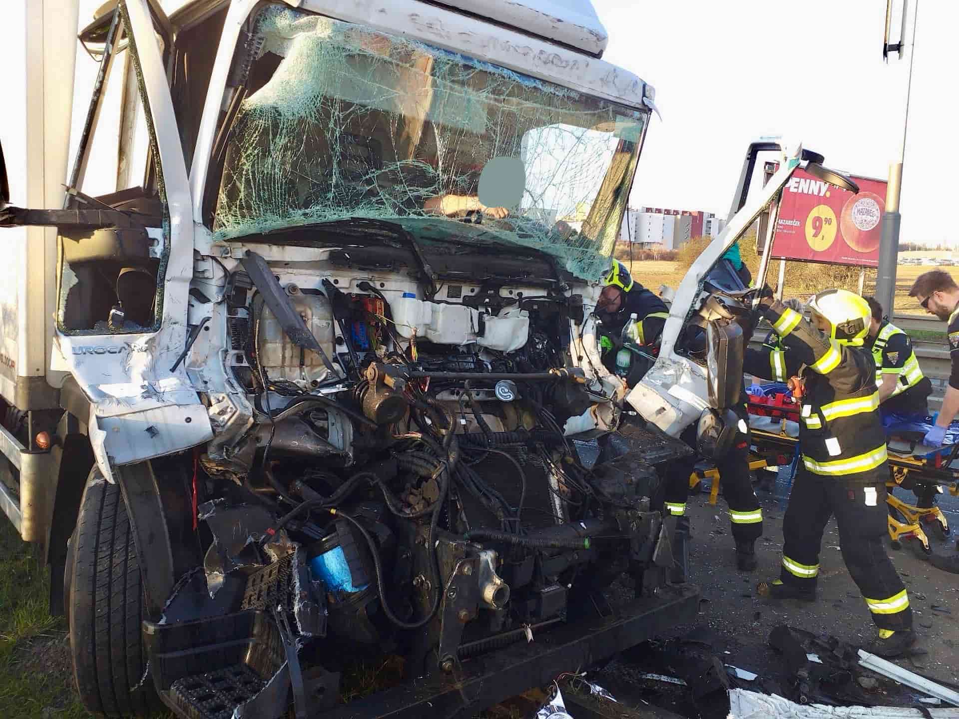 Vážná dopravní nehoda dvou nákladních vozidel výrazně zkomplikovala dopravu a vyžádala si zásah všech složek IZS. Jeden z řidičů zůstal zaklíněný a skončil v péči záchranářů.