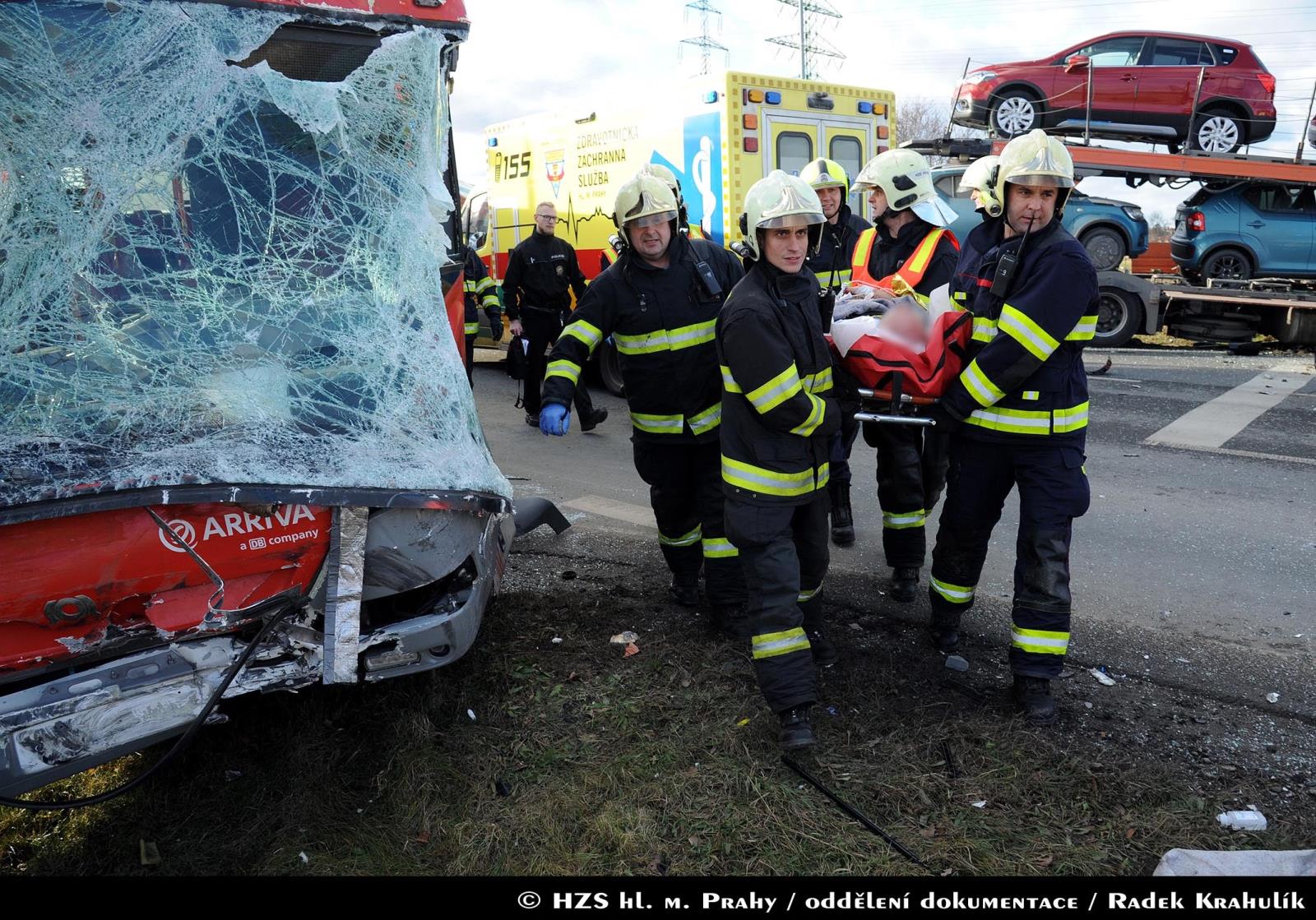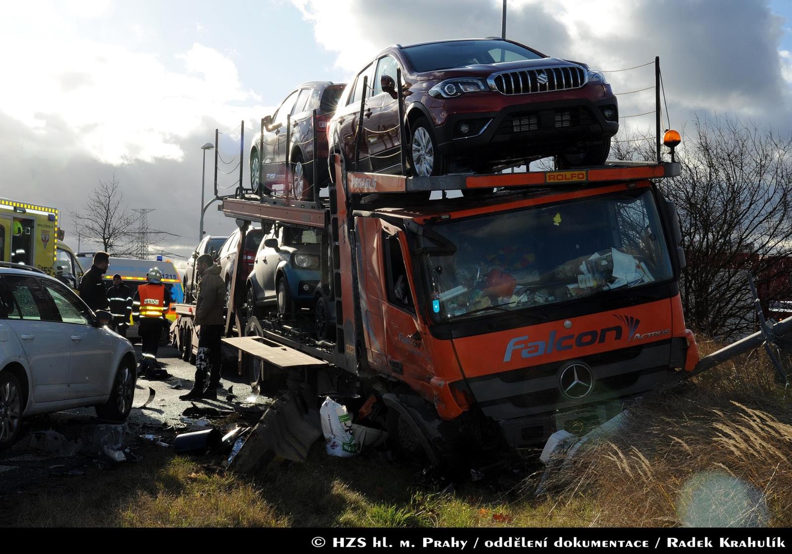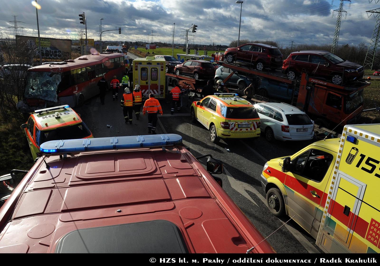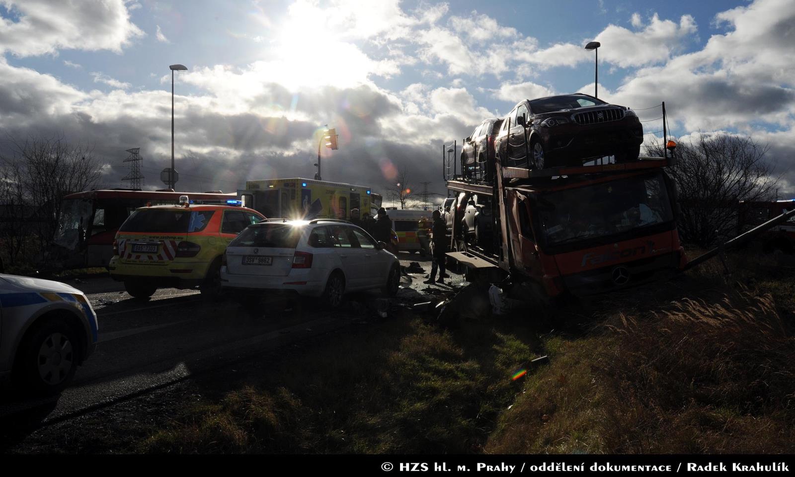 Dne 14.12.2017 v 11:02 hodin zasahovaly dvě jednotky pražských hasičů u nehody autobusu PID a nákladního vozidla, které převáželo osobní automobily. Nehoda se stala na křižovatce ulic K Šeberáku a Kunratická spojka.