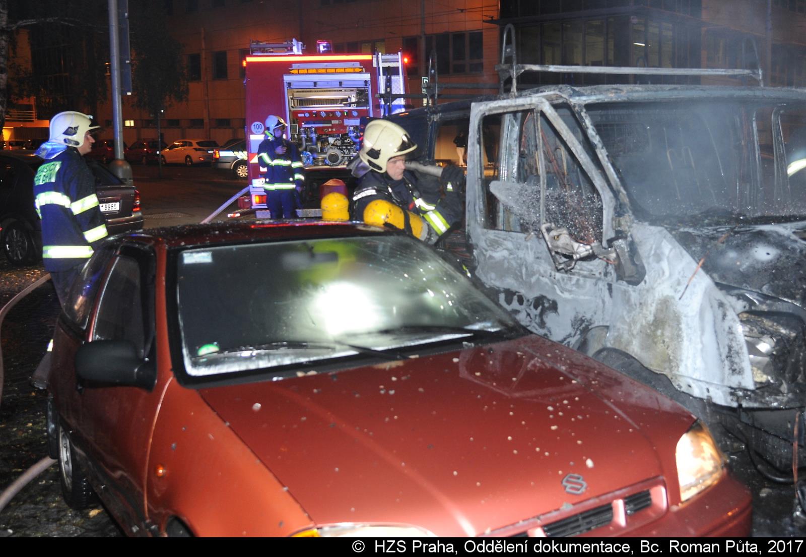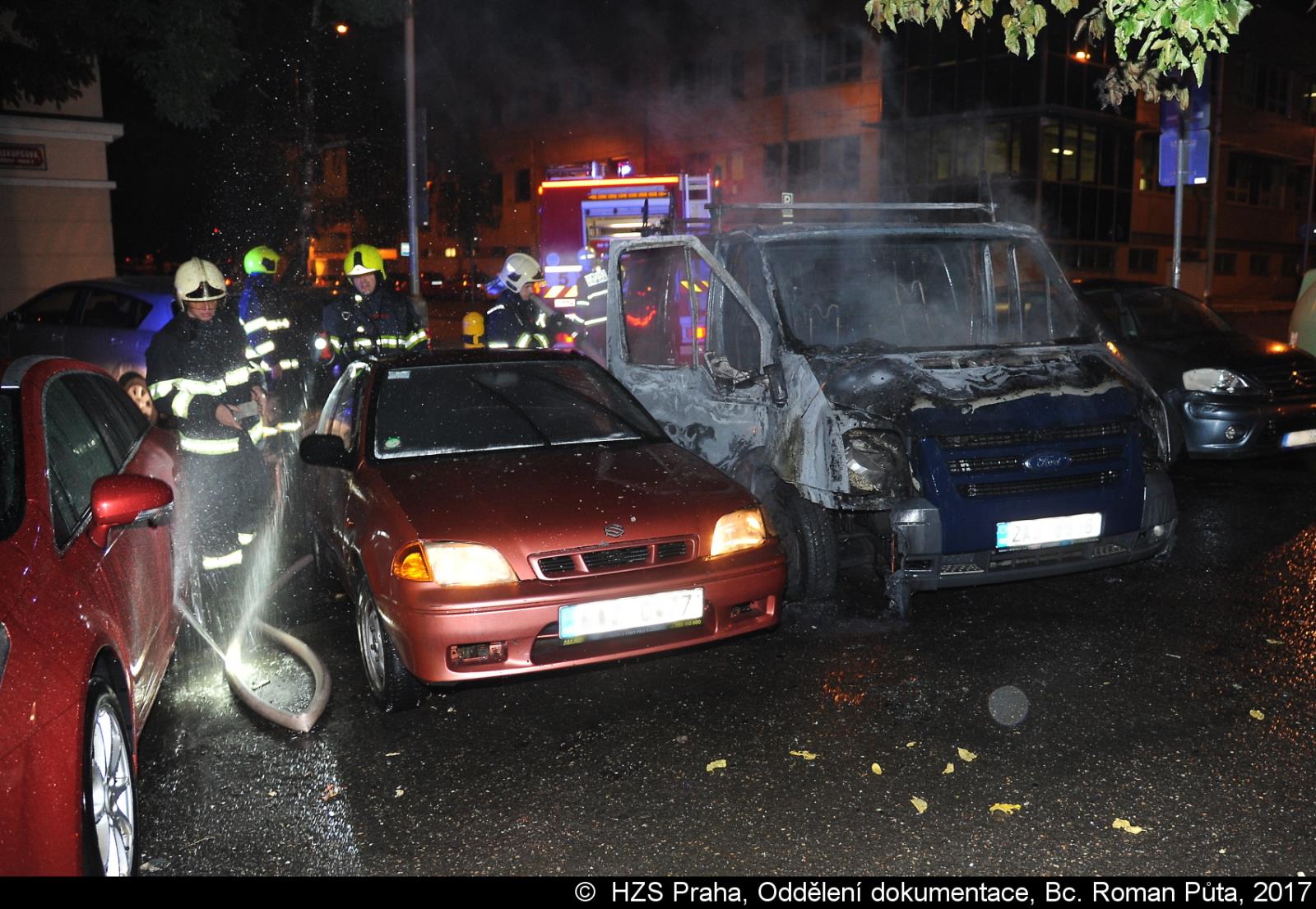 Za další hodinu vyjela jednotka ze Strašnic opět na Žižkov, tentokrát k požáru dodávky a osobního vozu. Obě vozidla byla zaparkována v ulici Biskupcova. Hasiči požár dostali pod kontrolu pomocí tlakové vody za několik minut.