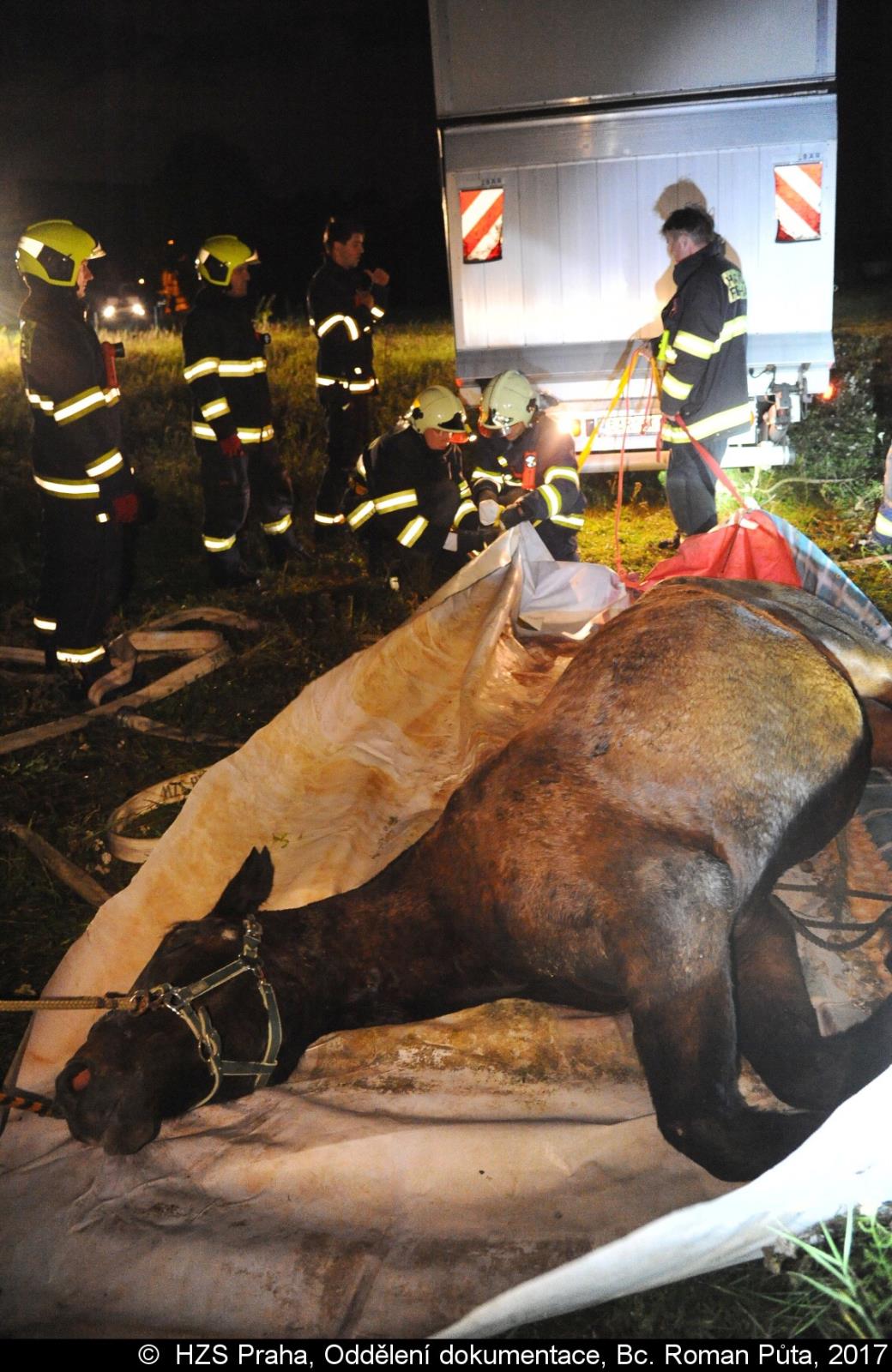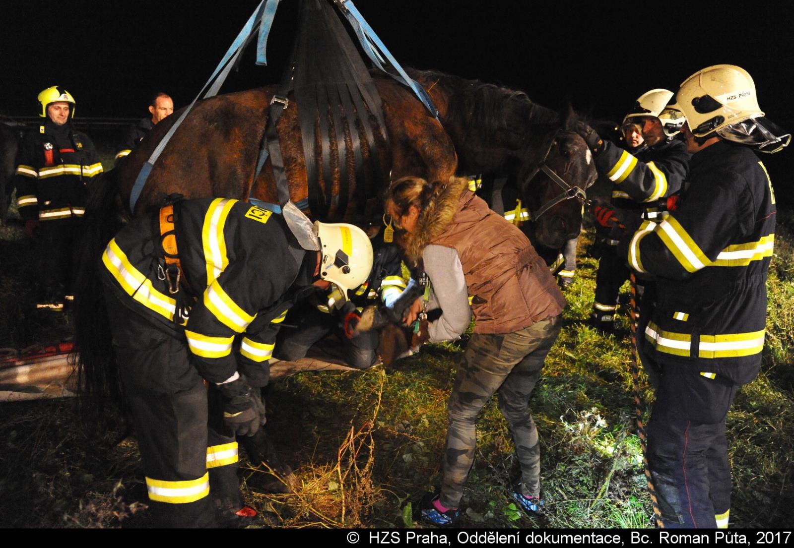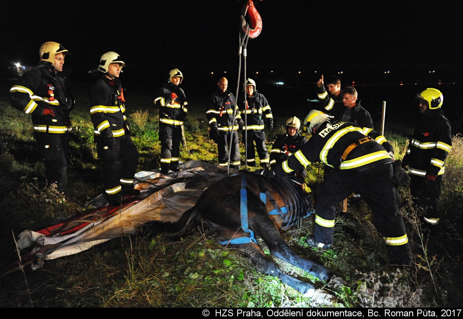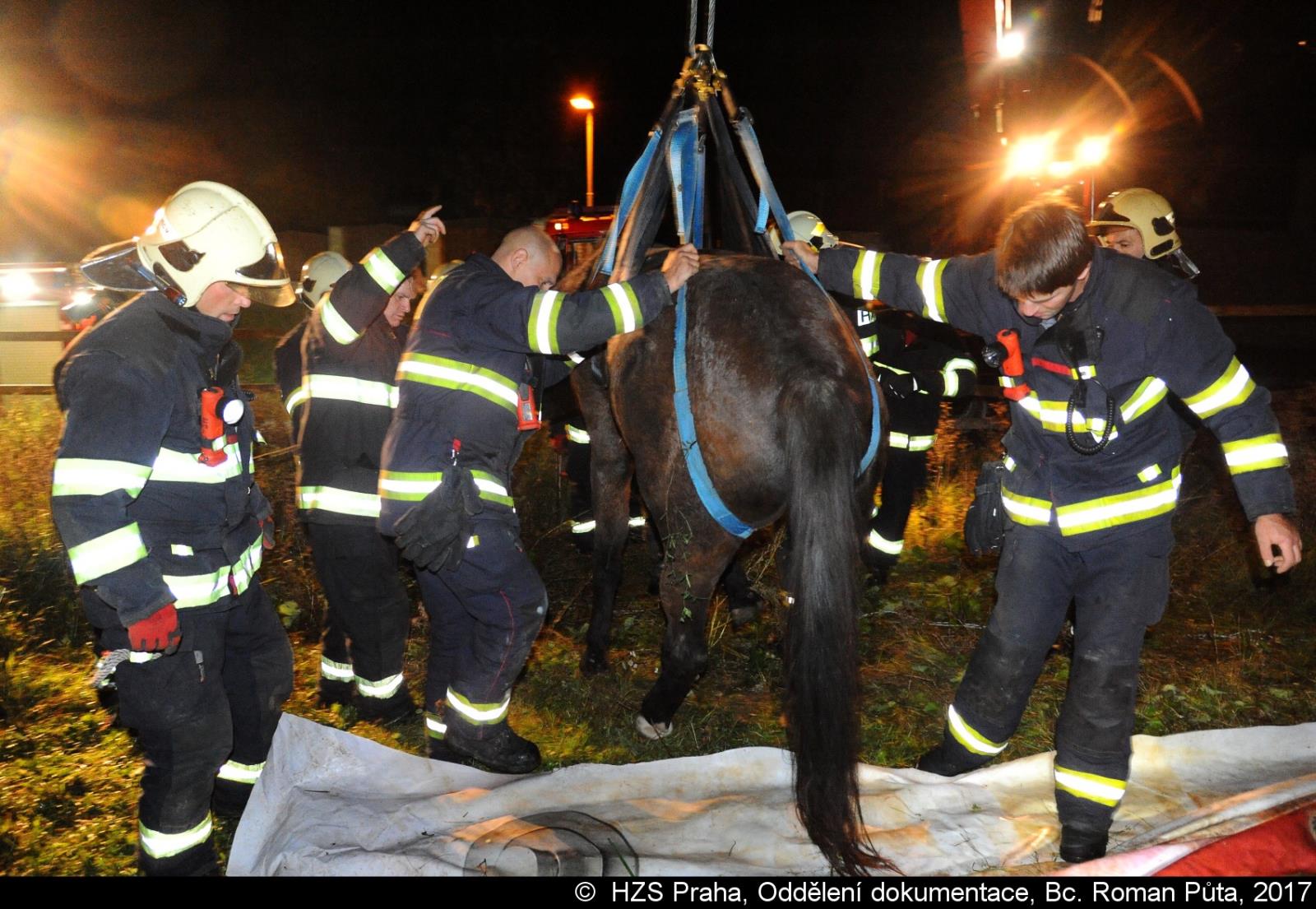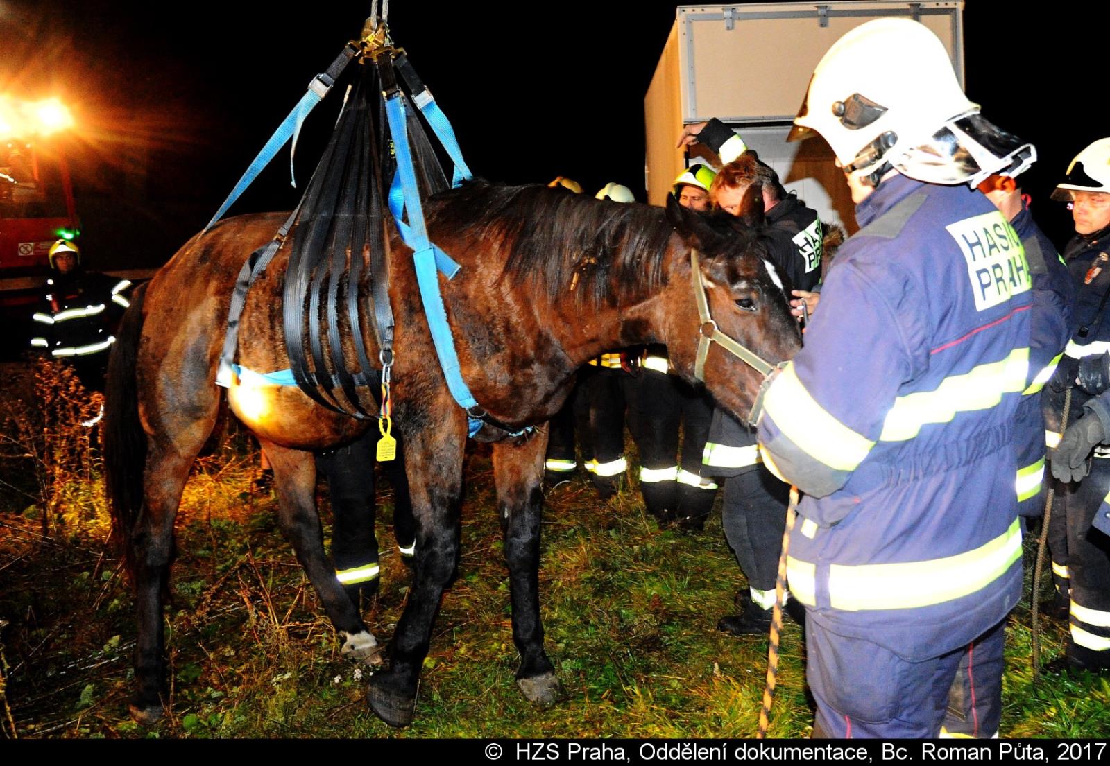 V pražském Lochkově hasiči zvedali koně pomocí jeřábu a speciálního postroje