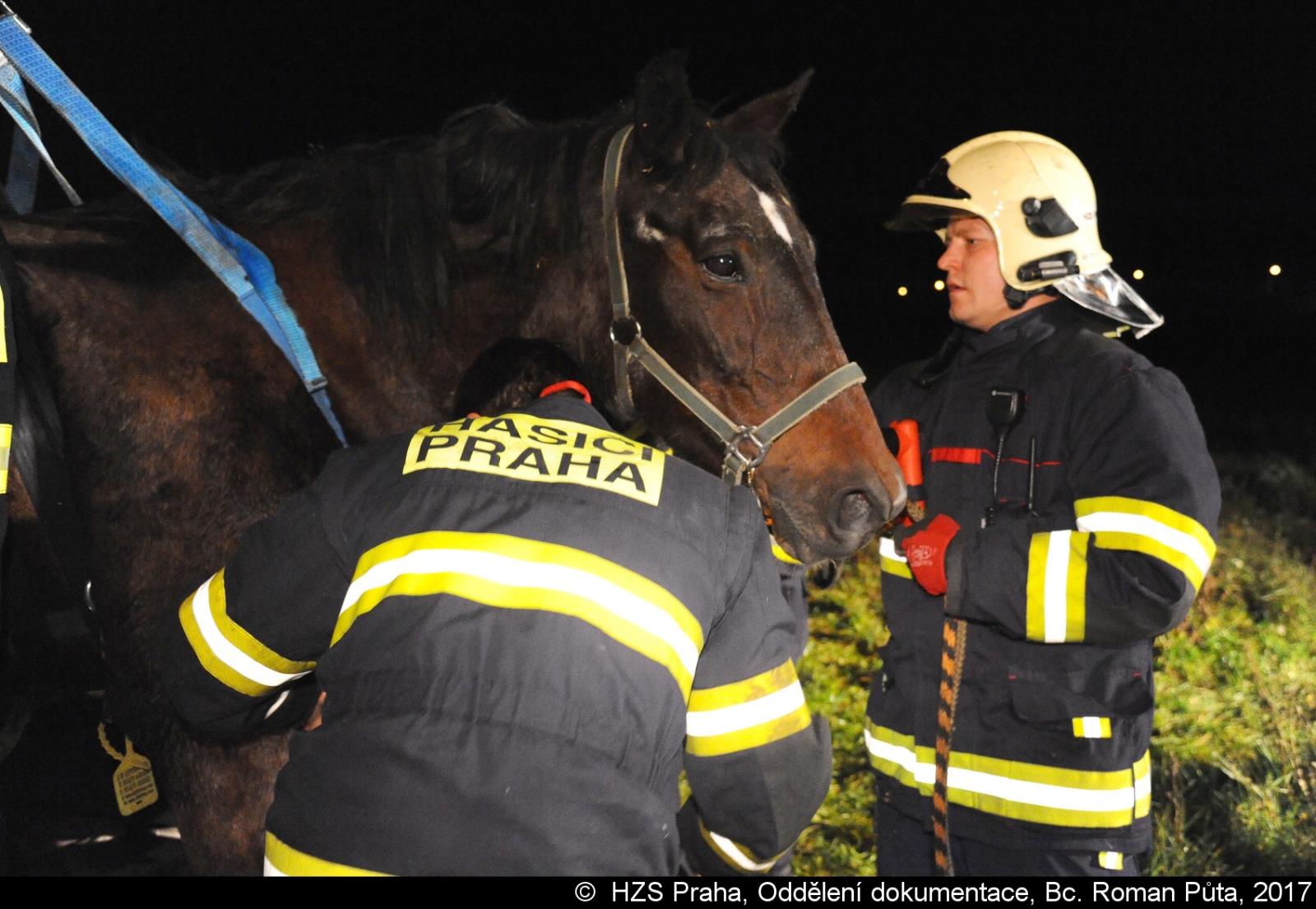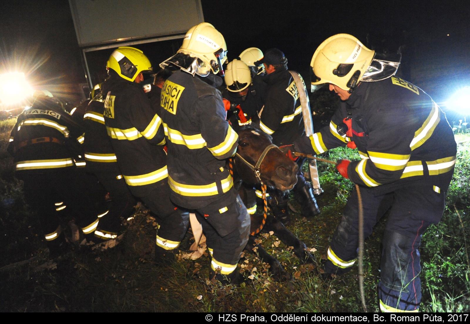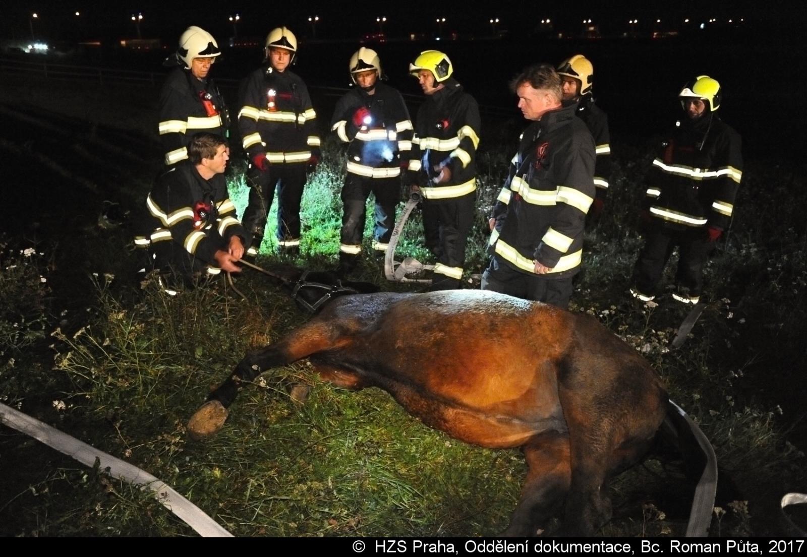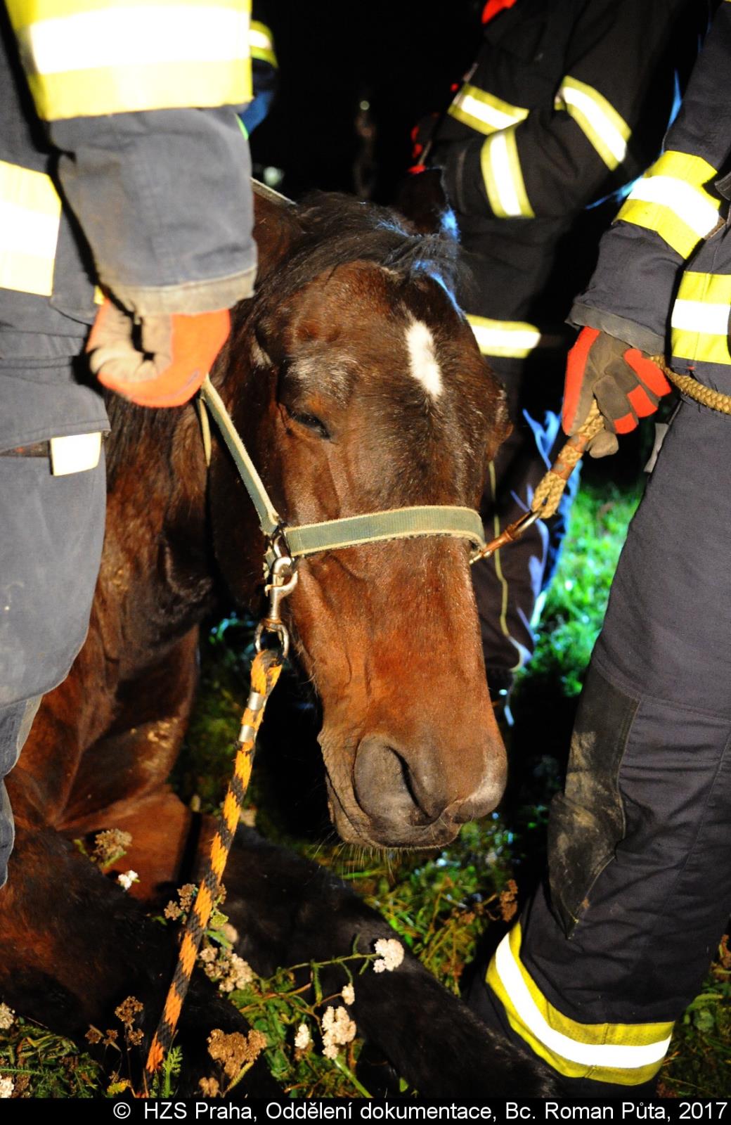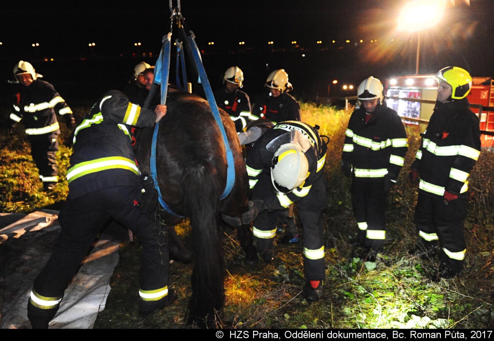 V pražském Lochkově hasiči zvedali koně pomocí jeřábu a speciálního postroje