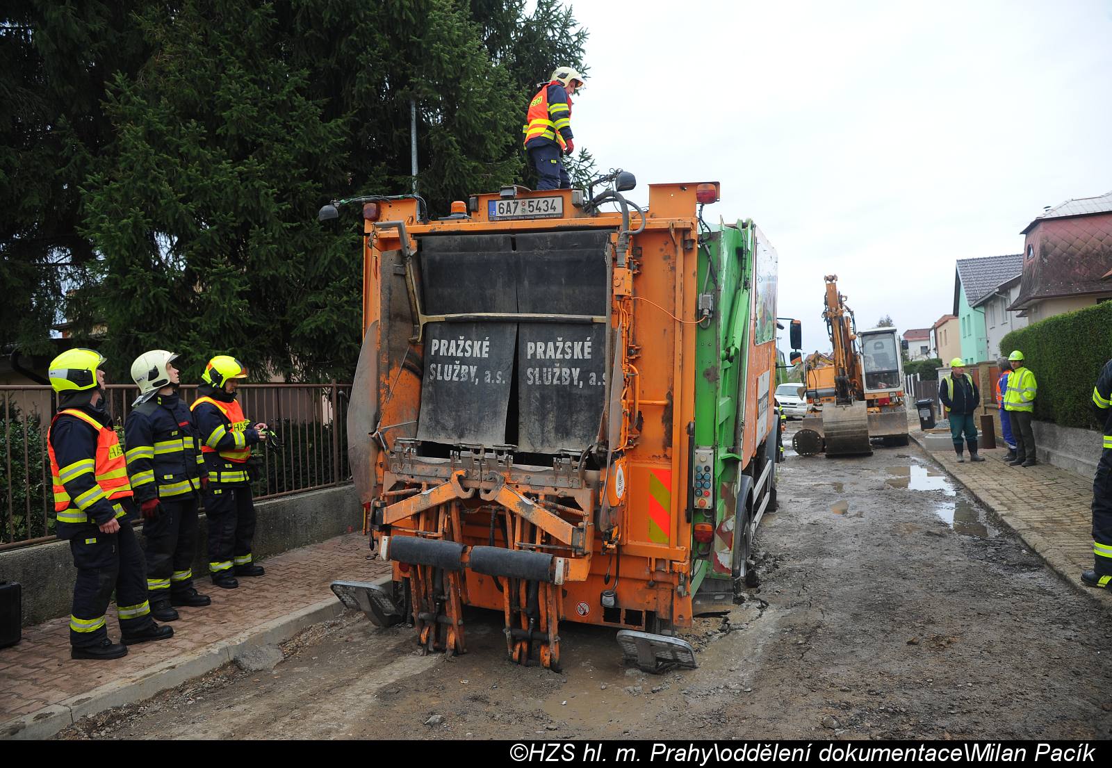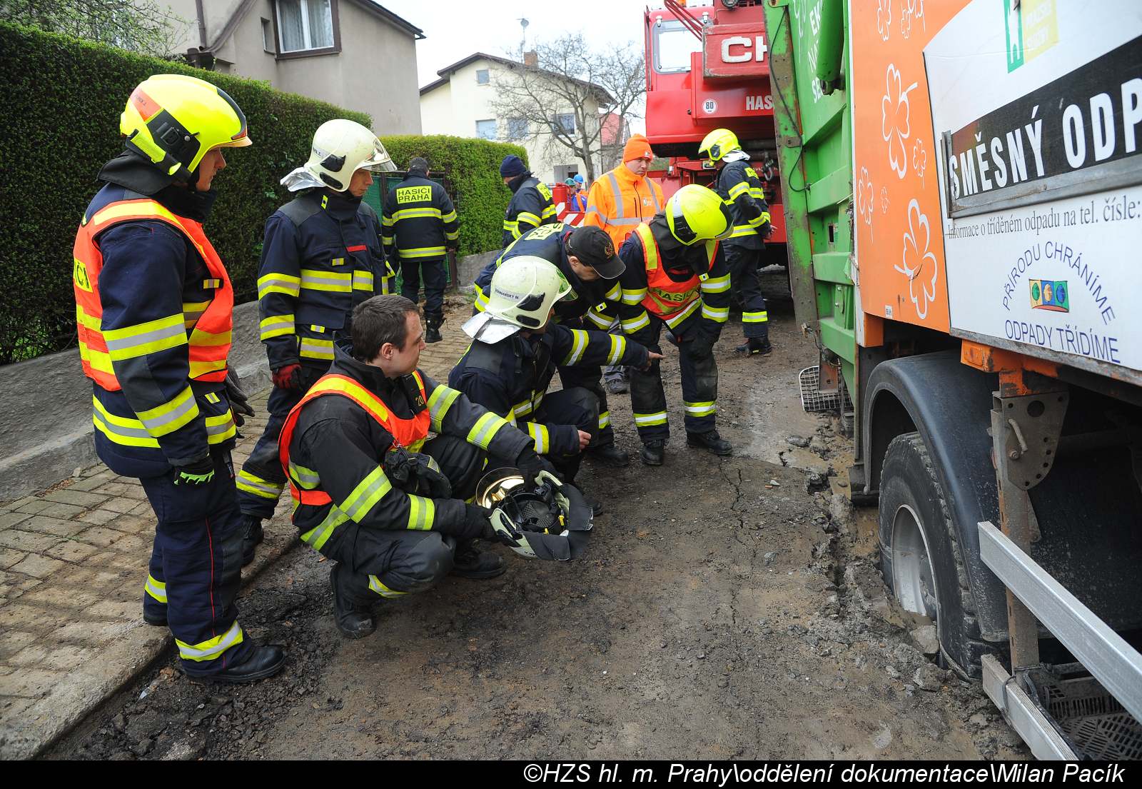 Hasiči vozidlo, které i s odpadky váží asi 15 tun, vyprostili pomocí jeřábu a bagru přítomné stavební firmy. U případu zasahovaly jednotky ze Strašnic a Pražského hradu.
