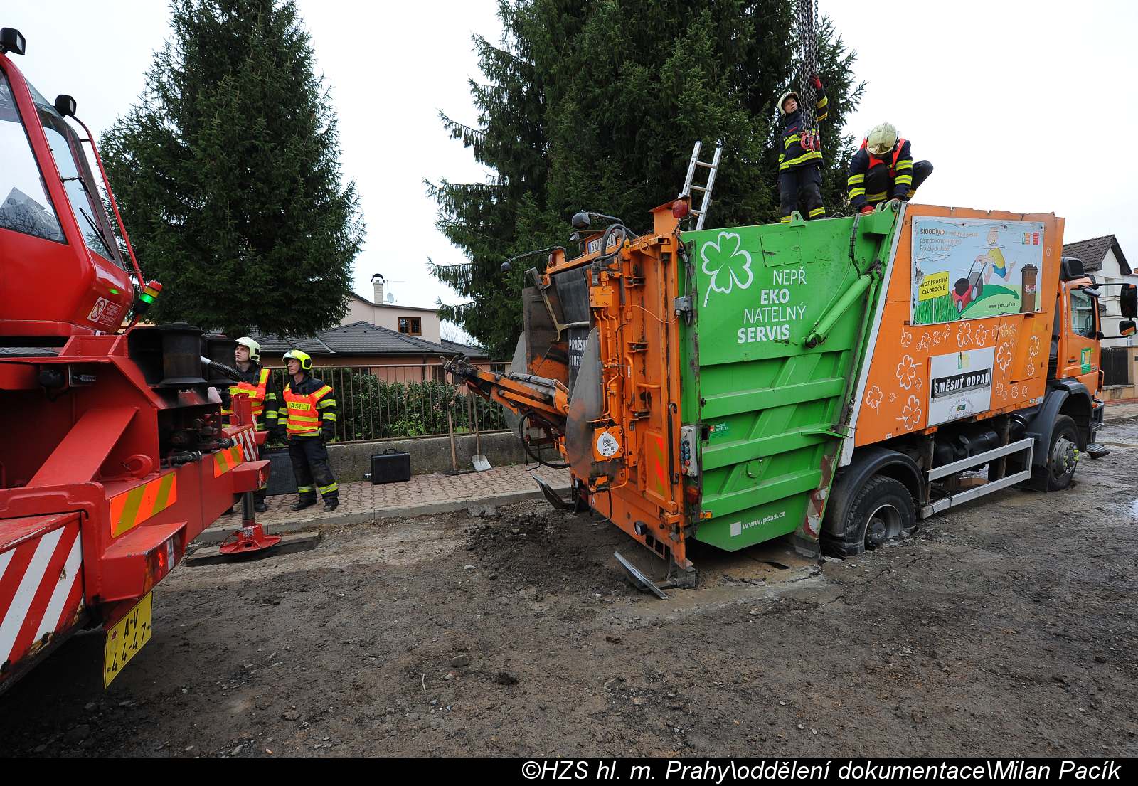 V pražském Suchdole se propadl popelářský vůz, hasiči ho vyprostili pomocí jeřábu