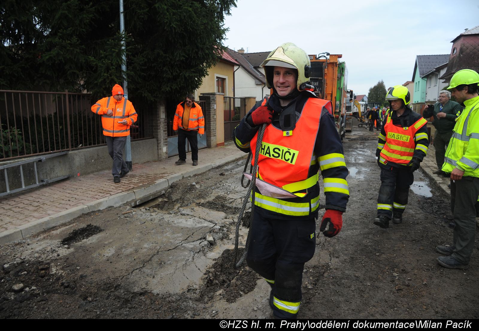 Dvě jednotky hasičů zasahovaly v pátek 07.04.2017 od 08:20 hodin v pražském Suchdole, kde se na rekonstruované ulici Májová propadl plně naložený popelářský vůz.