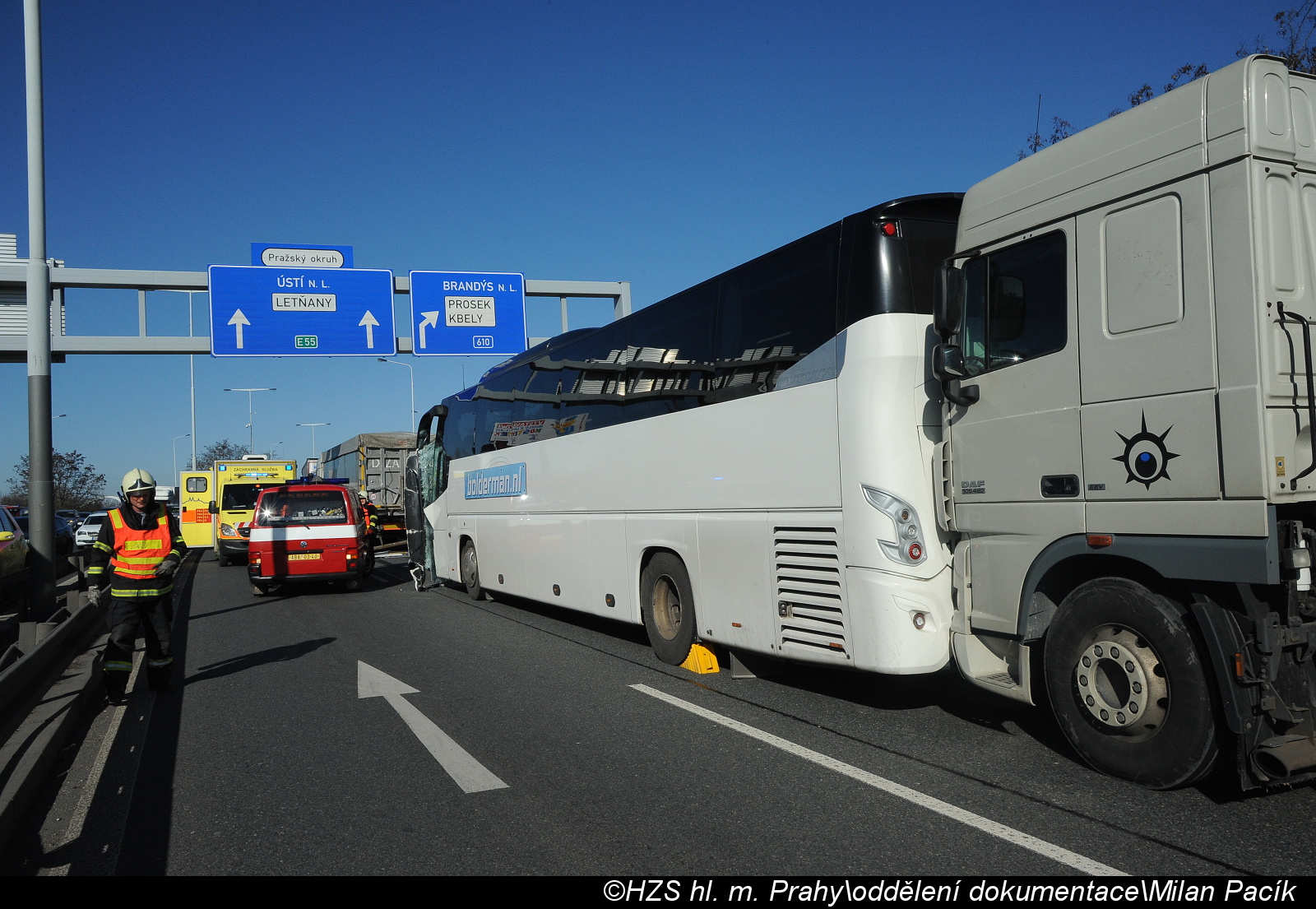 K nehodě došlo krátce po desáté hodině, když řidič jednoho z kamionů z dosud nezjištěných příčin narazil do jiného kamionu a zároveň zasáhl autobus. Následná kolize byla natolik vážná, že řidič autobusu zůstal zaklíněn ve svém vozidle a jeho vyproštění vyžadovalo zásah profesionálních hasičů.